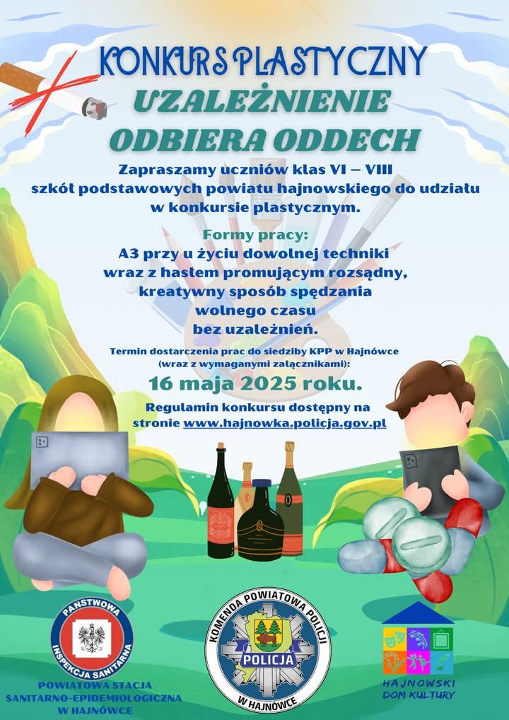 Państwowy Powiatowy Inspektor Sanitarny w Hajnówce zaprasza do udziału w konkursie plastycznym pn. "Uzależnienie odbiera oddech" w ramach programu „Mam wybór … wybieram rozsądek” w organizacji, którego współuczestniczy wraz z Komendą Powiatową Policji w Hajnówce oraz Hajnowskim Domem Kultury.