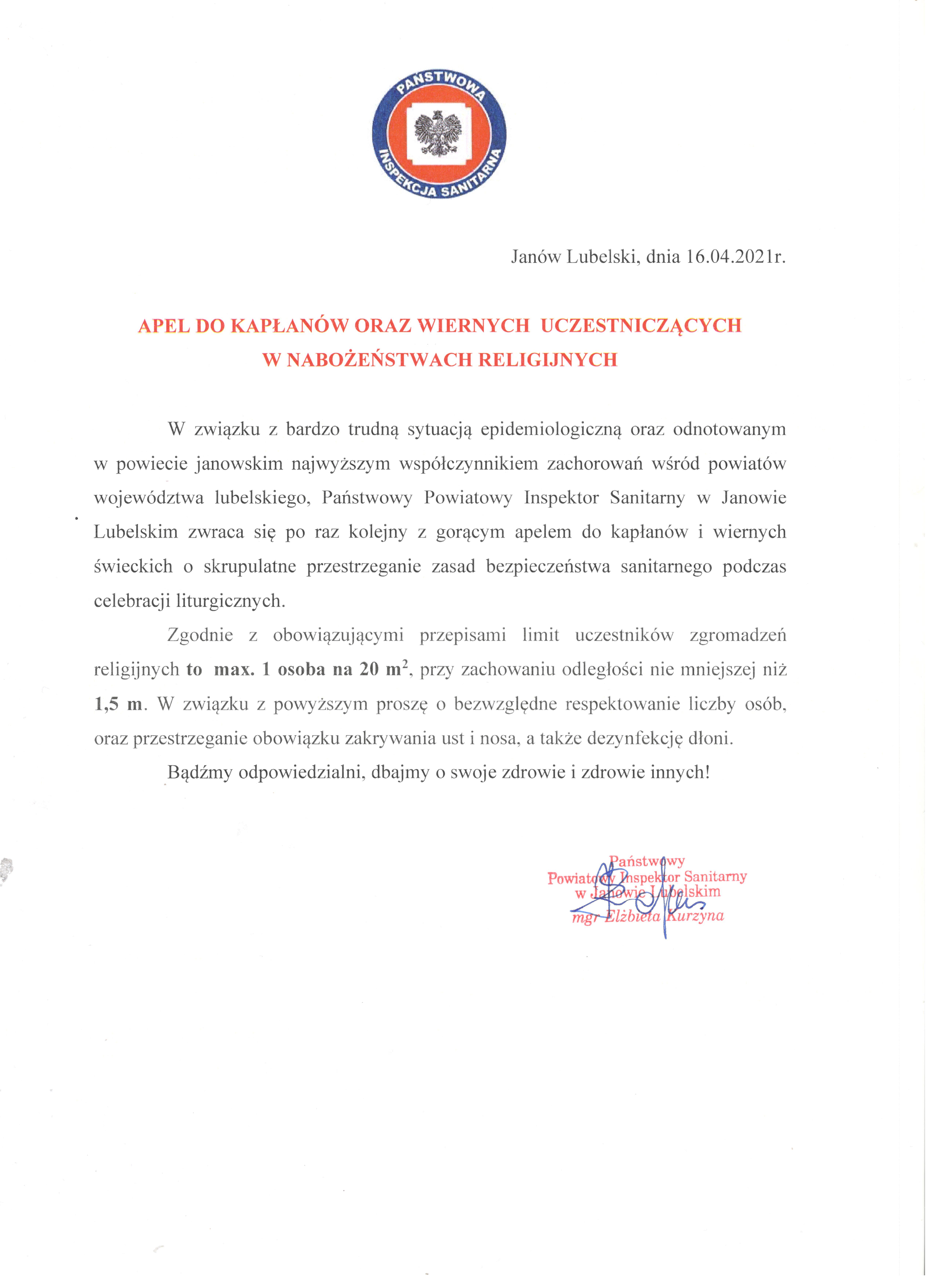 Apel Państwowego Powiatowego Inspektora Sanitarnego w Janowie Lubelskim do kapłanów oraz wiernych uczestniczących w nabożeństwach religijnych
