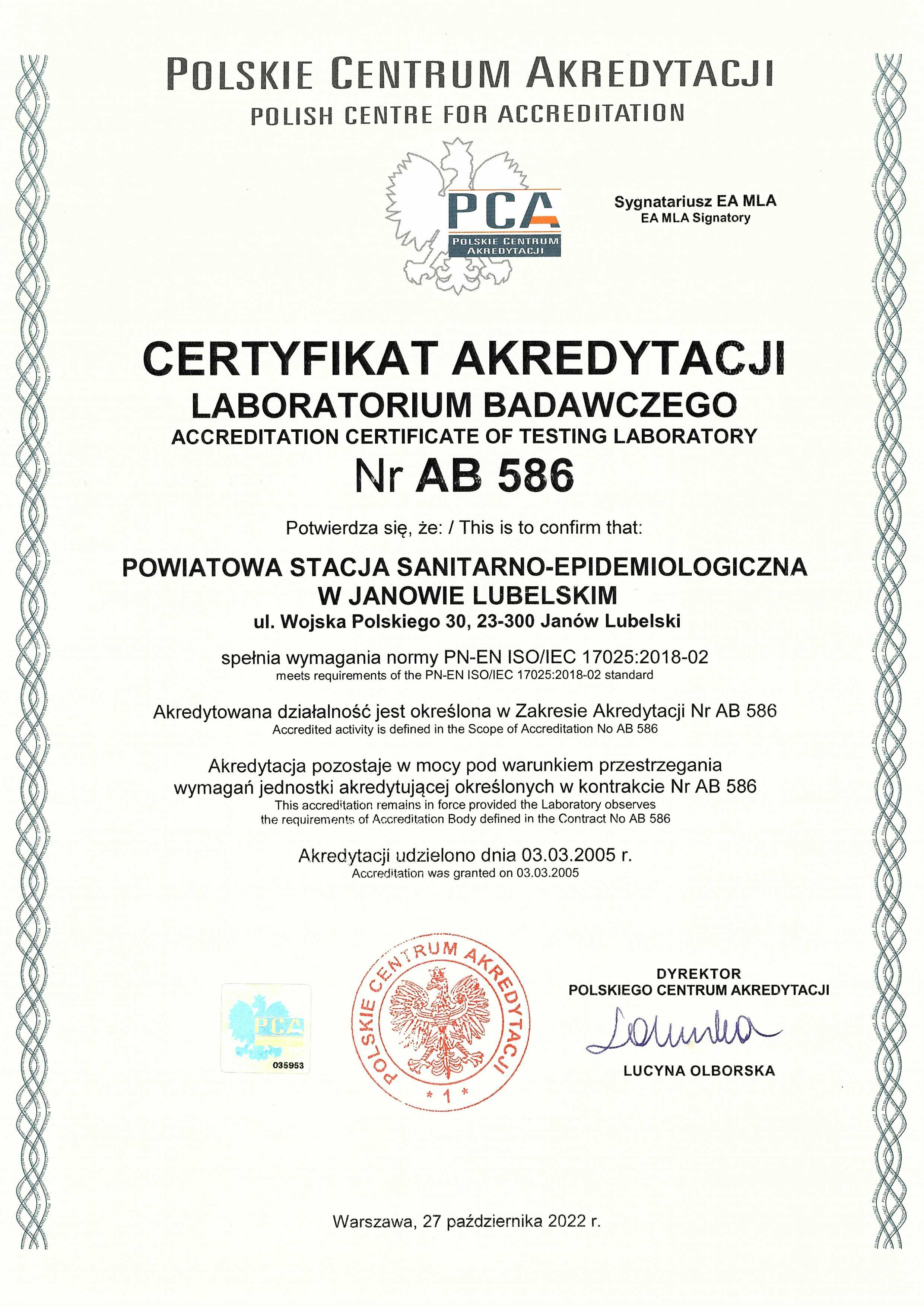 Akredytacja: AB 586 Akredytacja od: 03.03.2005 r. |