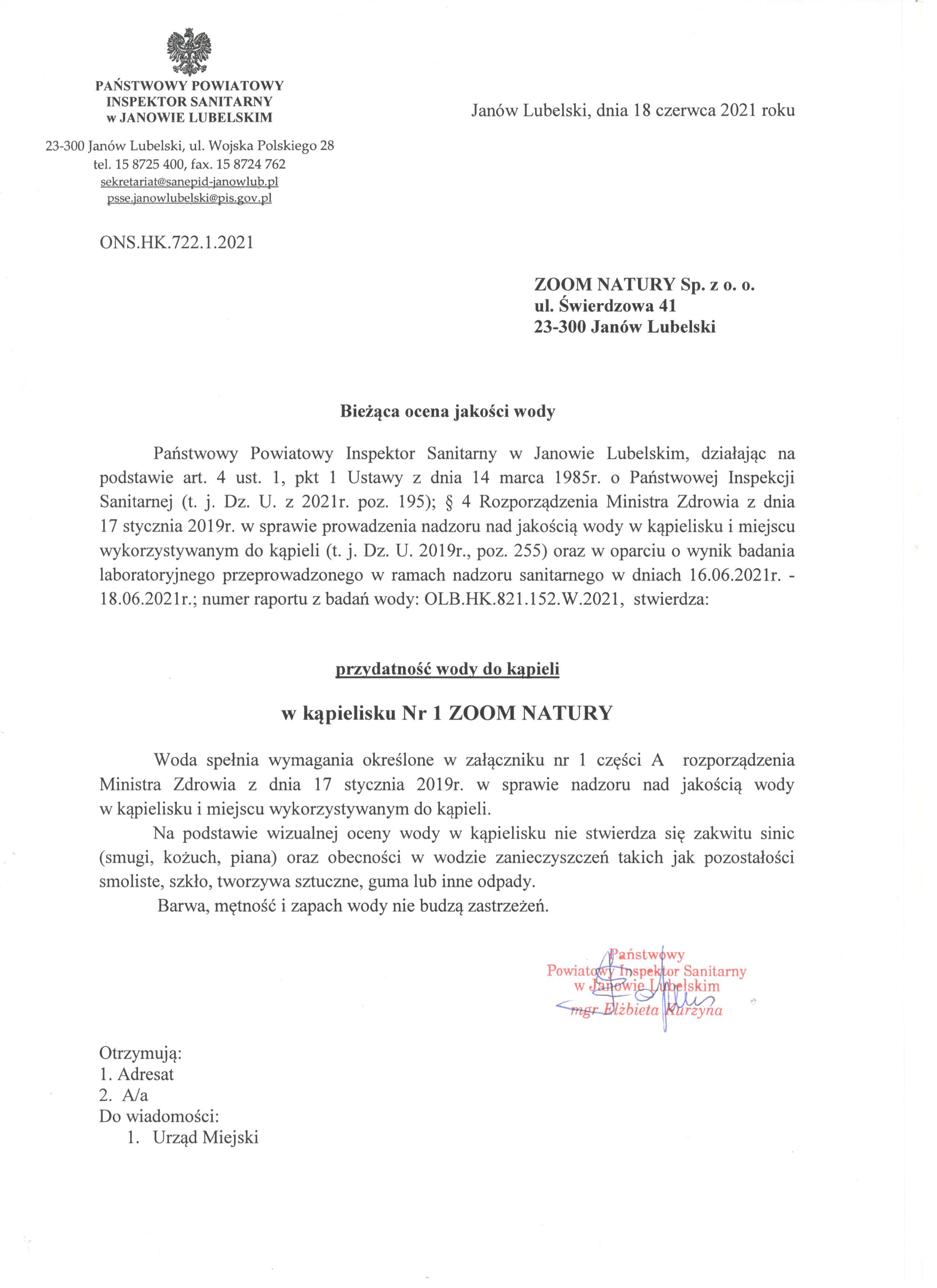 Państwowy Powiatowy Inspektor Sanitarny w Janowie Lubelskim, działając na podstawie art. 4 ust. 1, pkt 1 Ustawy z dnia 14 marca 1985r. o Państwowej Inspekcji Sanitarnej (t. j. Dz. U. z 2021r. poz. 195); § 4 Rozporządzenia Ministra Zdrowia z dnia 17 stycznia 2019r. w sprawie prowadzenia nadzoru nad jakością wody w kąpielisku i miejscu wykorzystywanym do kąpieli (t. j. Dz. U. 2019r., poz. 255) oraz w oparciu o wynik badania laboratoryjnego przeprowadzonego w ramach nadzoru sanitarnego w dniach 16.06.2021r. - 18.06.2021r.; numer raportu z badań wody: OLB.HK.821.152.W.2021, stwierdza: