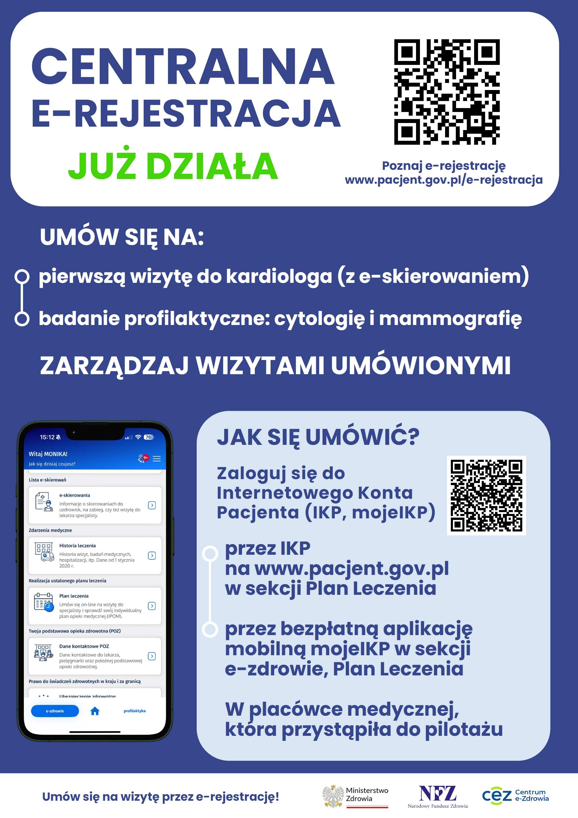 Pacjentki i pacjenci samodzielnie zapiszą się na pierwszą wizytę do kardiologa (z e-skierowaniem) oraz na cytologię i mammografię (bez skierowania, zgodnie z zasadami programów profilaktycznych) przez: