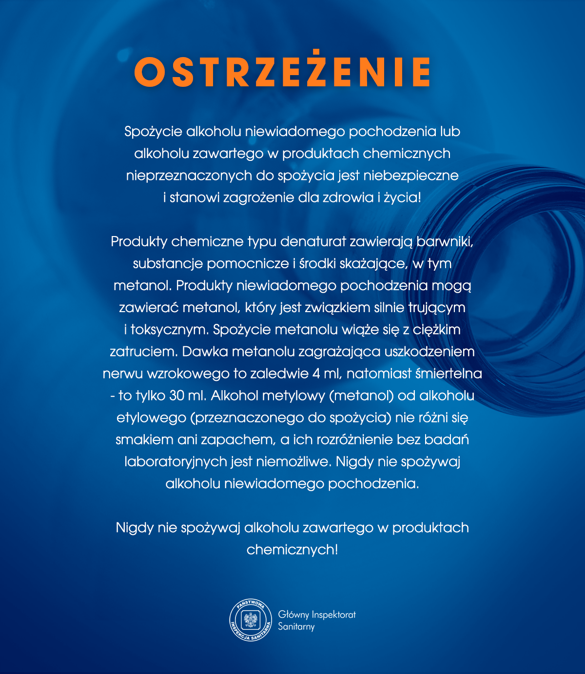 Spożycie alkoholu niewiadomego pochodzenia lub alkoholu zawartego w produktach chemicznych nieprzeznaczonych do spożycia jest niebezpieczne i stanowi zagrożenie dla zdrowia i życia!