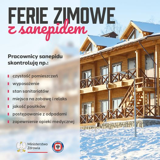 Pracownicy Państwowej Inspekcji Sanitarnej zadbają o to, aby dzieci spędziły czas bezpiecznie i zdrowo. Podobnie jak latem sanepid sprawdzi warunki w miejscach wypoczynku w każdej formie – zarówno wyjazdowej np. na obozach, jak i w miejscu zamieszkania np. na półkoloniach i „zimach w mieście”. Kontrole mogą mieć charakter planowy lub interwencyjny - po zgłoszeniu nieprawidłowości zgłoszonych np. przez rodziców uczestnika obozu.