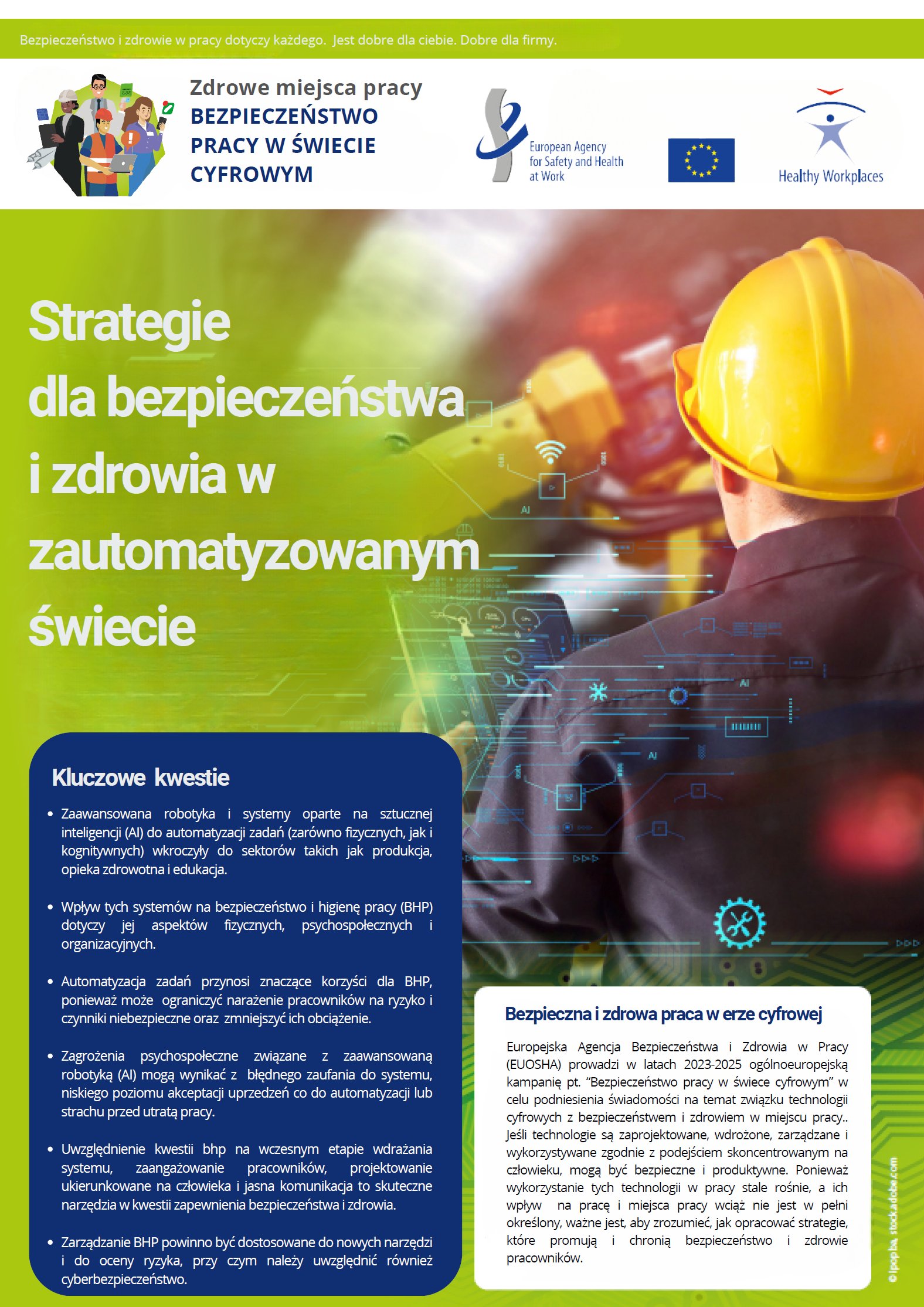 Europejska Agencja Bezpieczeństwa i Zdrowia w Pracy(EUOSHA) prowadzi w latach 2023-2025 ogólnoeuropejską kampanię pt. “Bezpieczeństwo pracy w świece cyfrowym” wcelu podniesienia świadomości na temat związku technologii cyfrowych z bezpieczeństwem i zdrowiem w miejscu pracy.