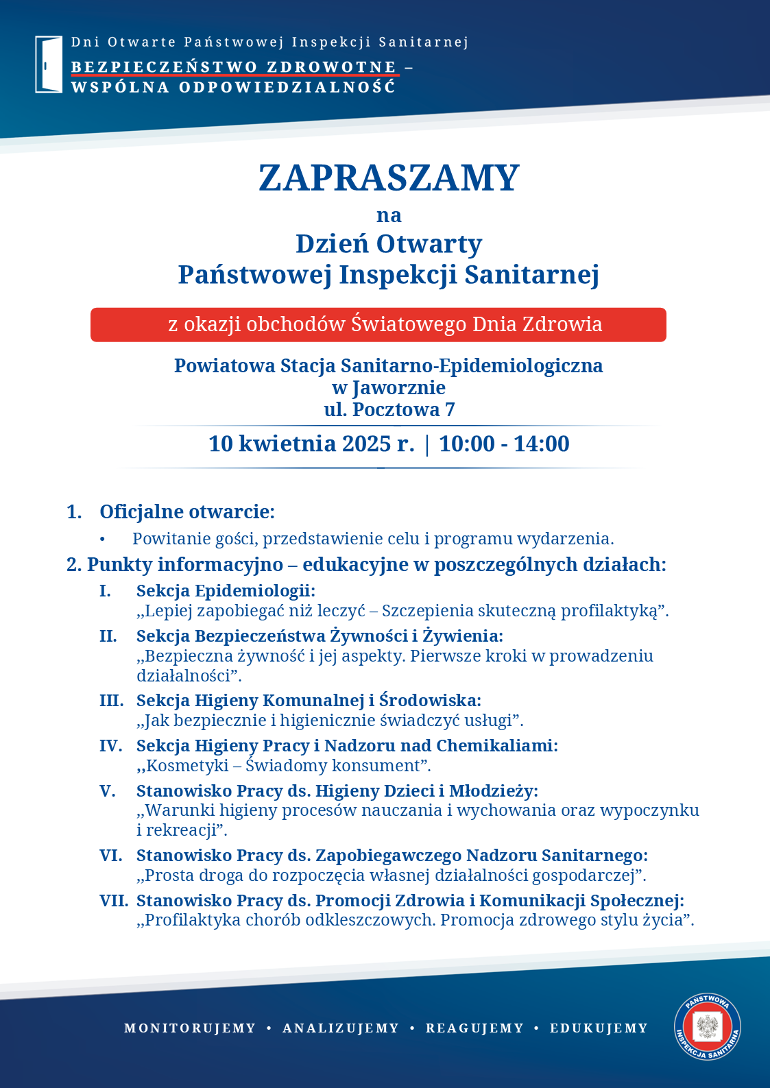 Państwowy Powiatowy Inspektor Sanitarny w Jaworznie zaprasza mieszkańców miasta na Dzień Otwarty Państwowej Inspekcji Sanitarnej organizowany przez Powiatową Stację Sanitarno-Epidemiologiczną w Jaworznie. Jest to doskonała okazja, aby poznać bliżej naszą działalność, zadania oraz znaczenie inspekcji sanitarnej w zapewnianiu zdrowia i bezpieczeństwa publicznego.