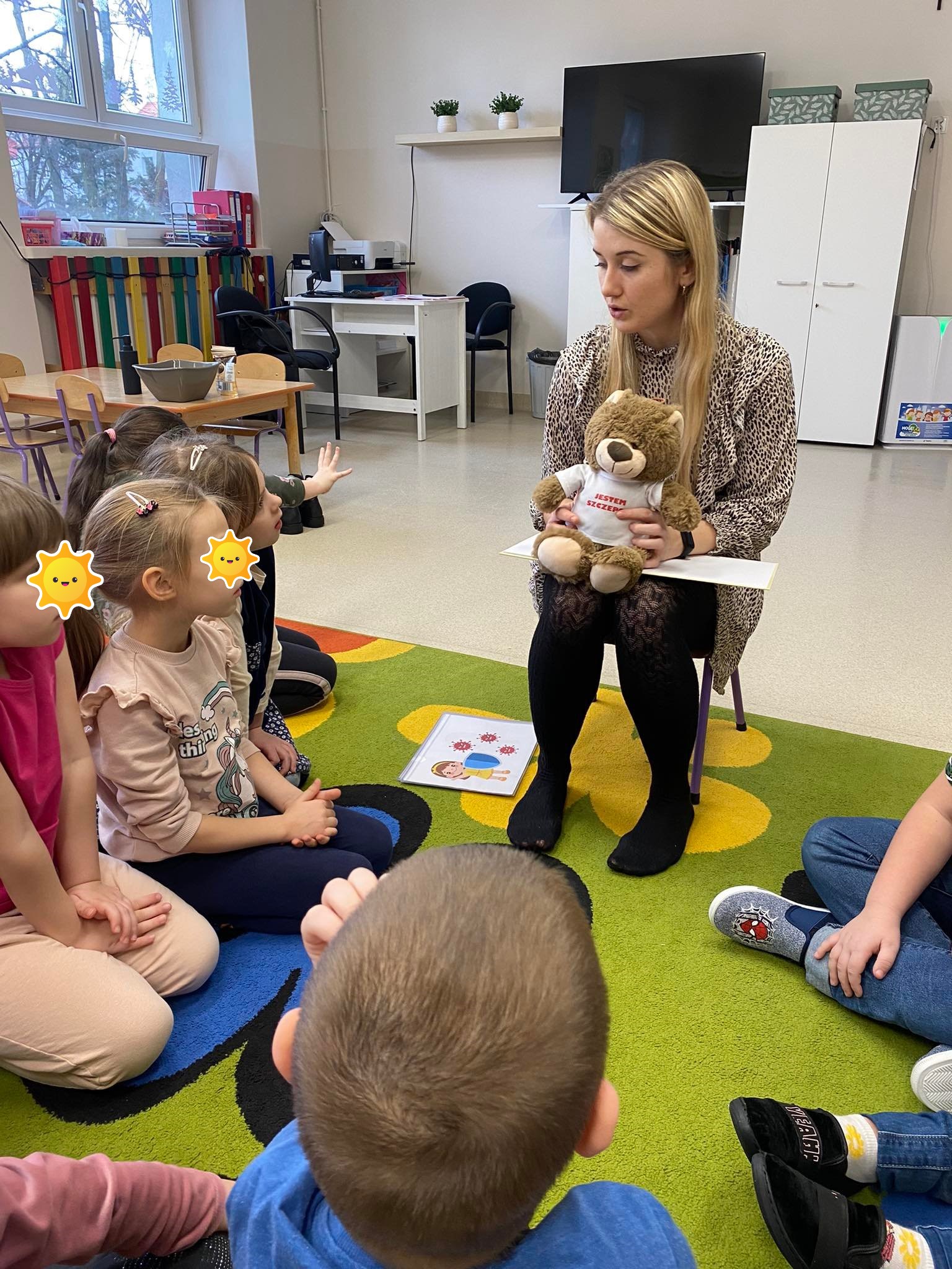 w Jaworznie. Na początku zajęć zostały przypomniane zasady prawidłowego mycia rąk. Przedszkolaki zobaczyły doświadczenie z użyciem pieprzu, wody i płynu do mycia naczyń, które miało uświadomić ich o konieczności używania mydła. W towarzystwie misia Szczepana dzieci wysłuchały pogadanki o zasadzie działania szczepionek