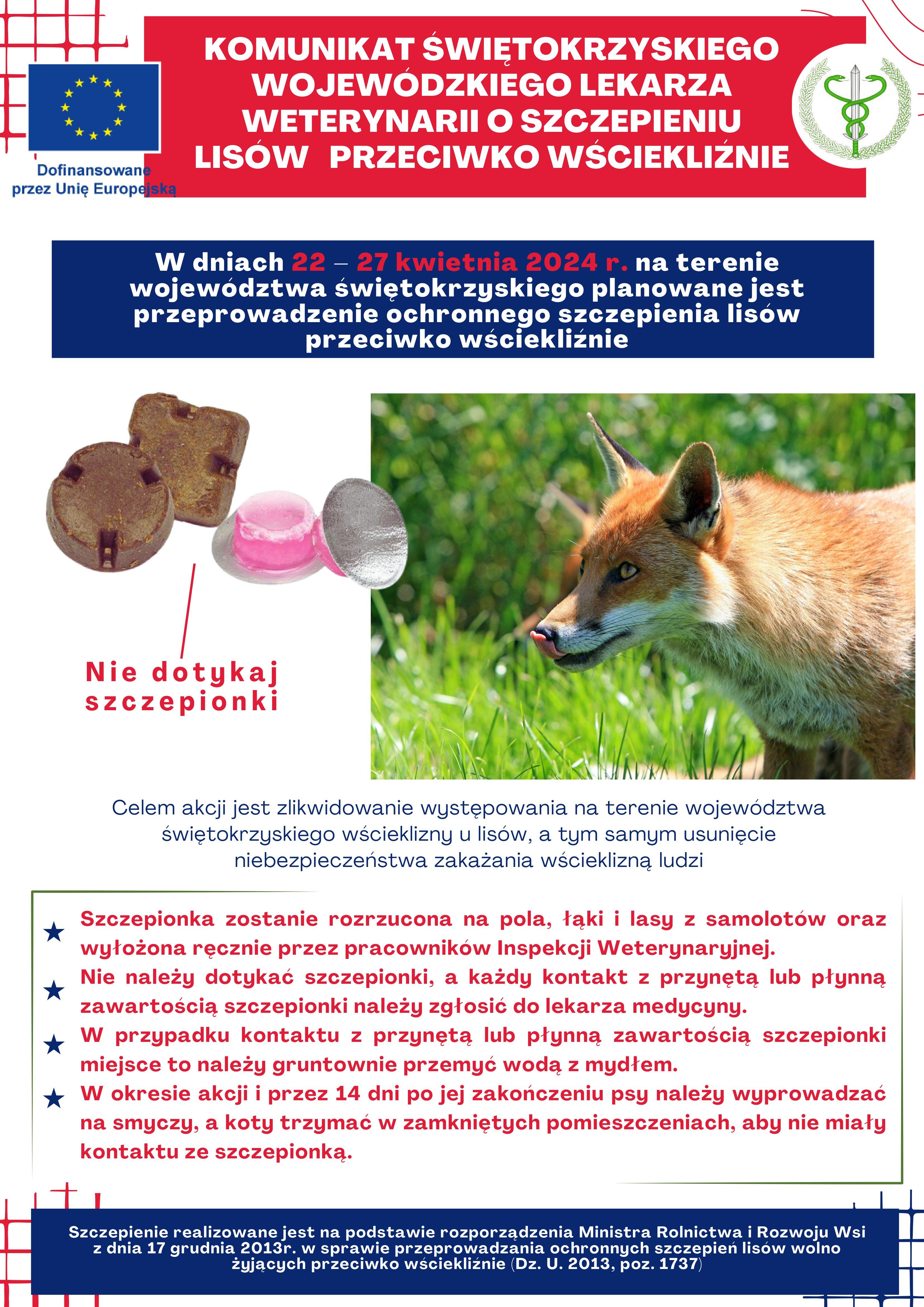 W dniach 22 – 27.04.2024 r. zostanie przeprowadzona na terenie województwa świętokrzyskiego wiosenna akcja ochronnego szczepienia lisów wolno żyjących przeciwko wściekliźnie.