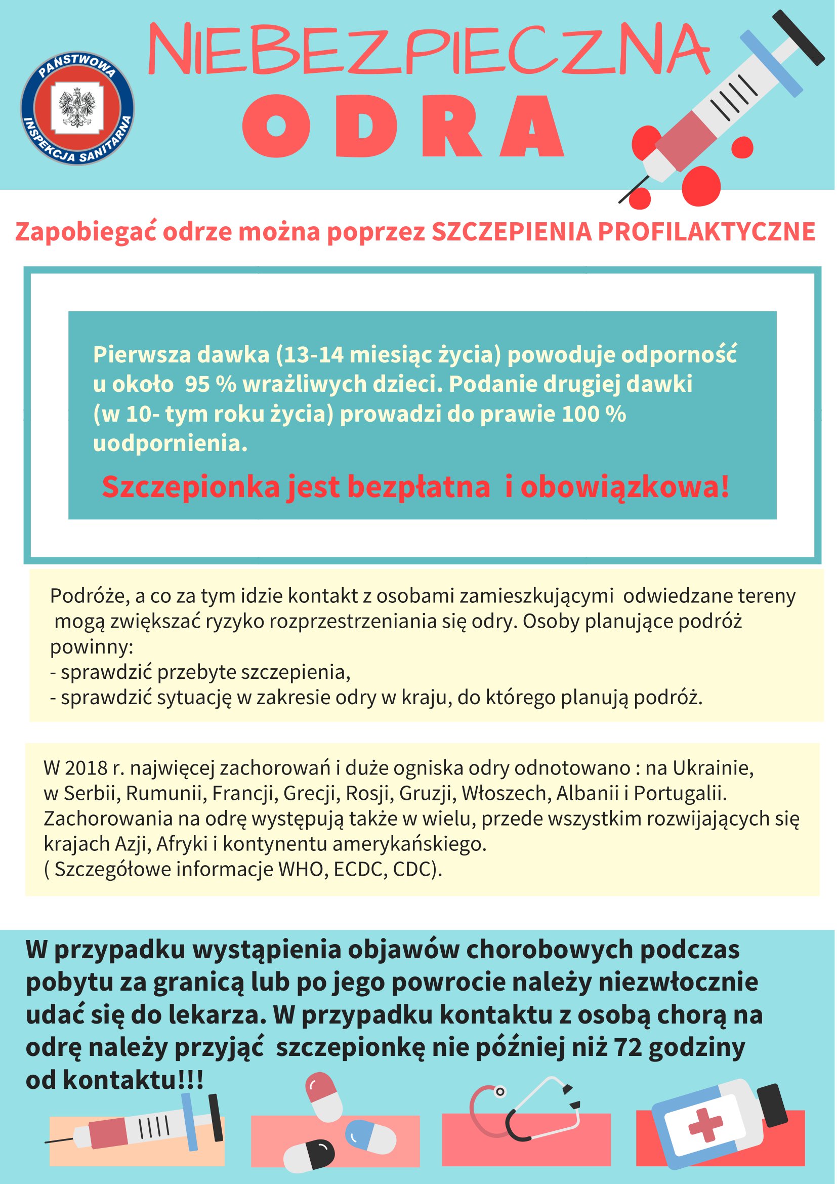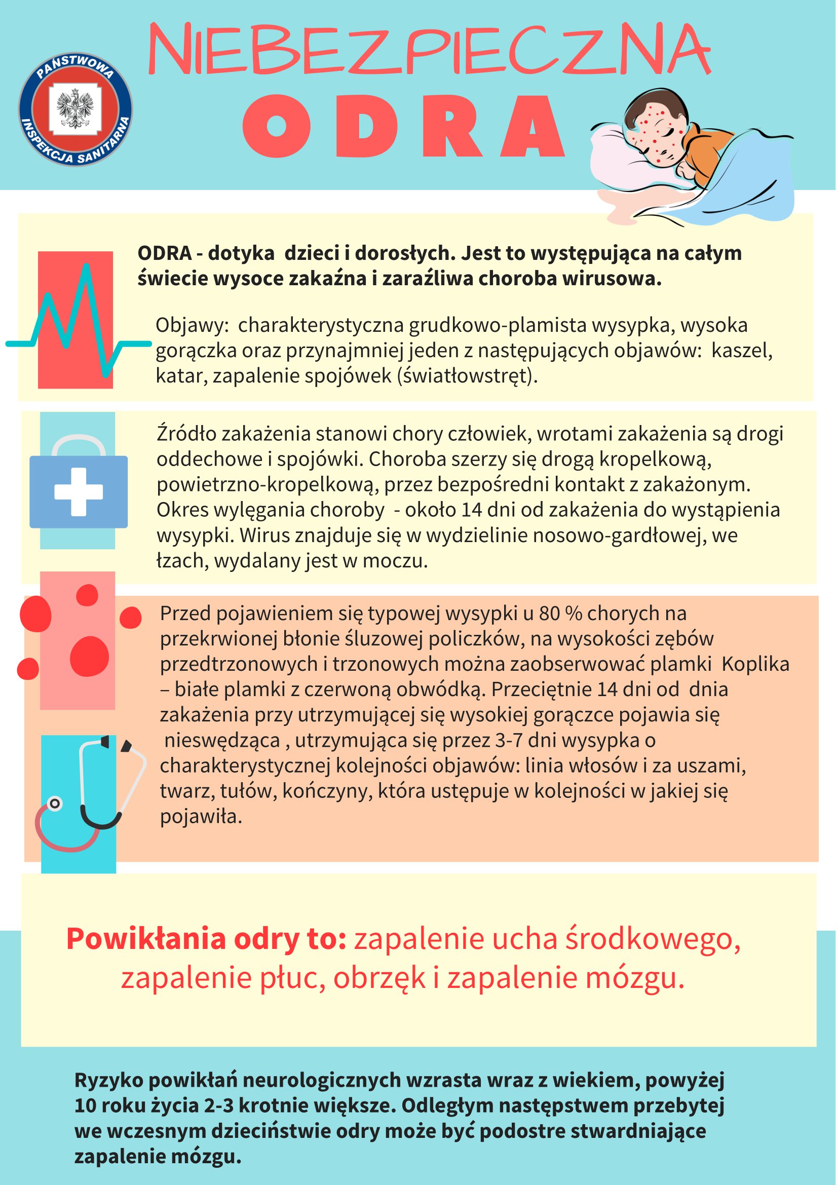 Państwowy Powiatowy Inspektor Sanitarny w Jędrzejowie, w związku z pojawiającymi się doniesieniami o niepokojącej sytuacji w zakresie zachorowań na odrę w Polsce informuje, iż odra jest ostrą chorobą wirusową przebiegającą z gorączką, kaszlem, zapaleniem spojówek oraz wysypką. Jednocześnie jest to choroba, która może mieć, u osób które uległy zakażeniu, poważne odległe konsekwencje zdrowotne w postaci groźnych powikłań neurologicznych.