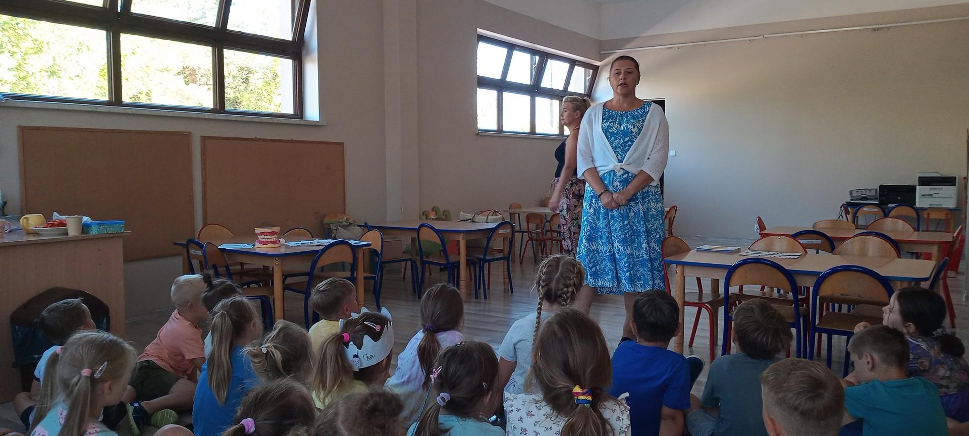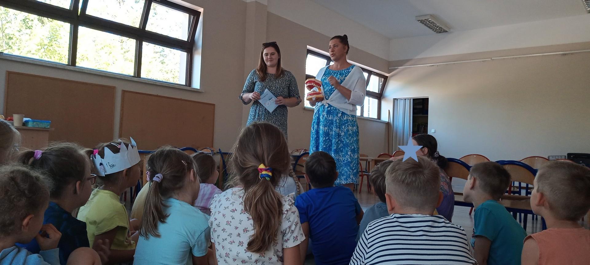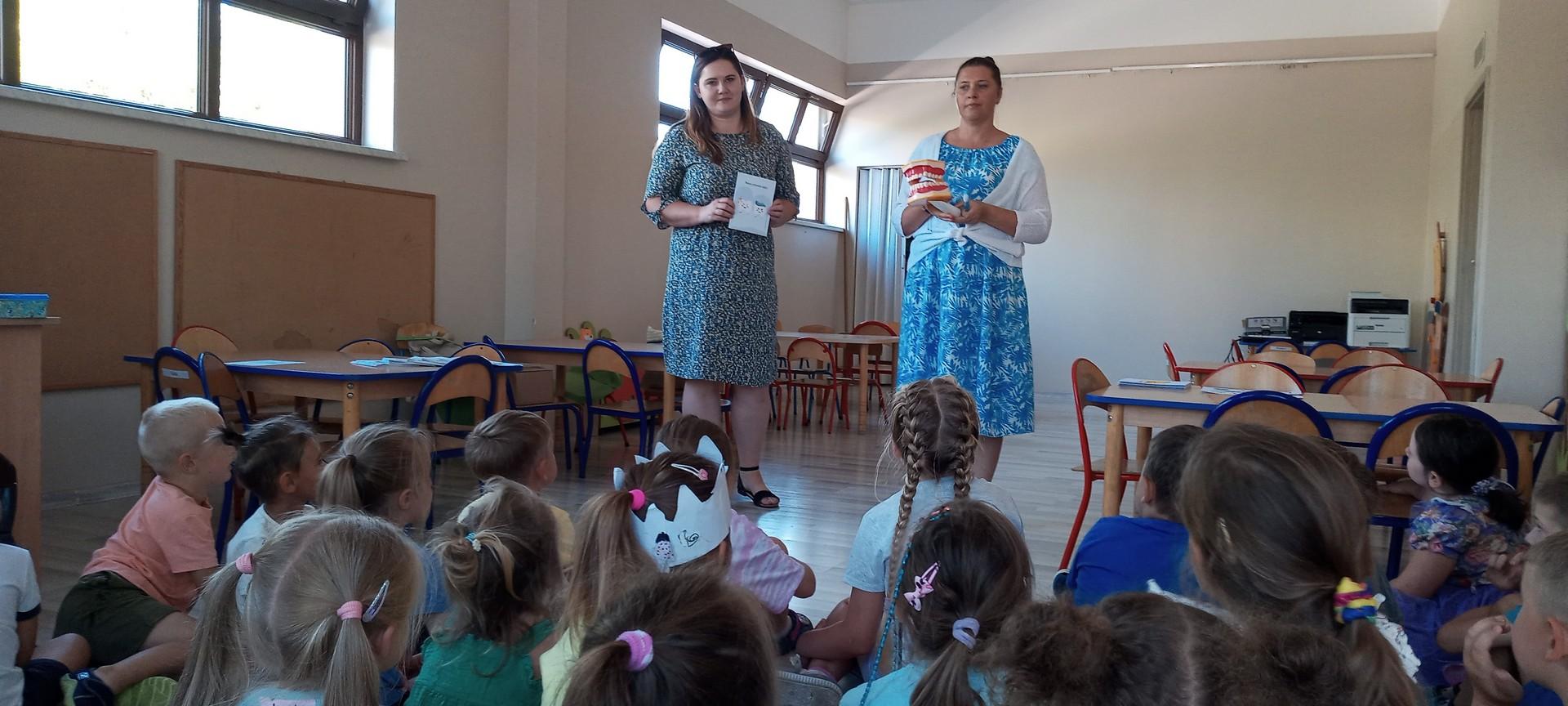 Wśród przedszkolaków z najstarszej grypy Agnieszka Stępniak i Joanna Jaroma-Woźniak przeprowadziły pogadankę połączoną z instruktażem prawidłowego mycia zębów.