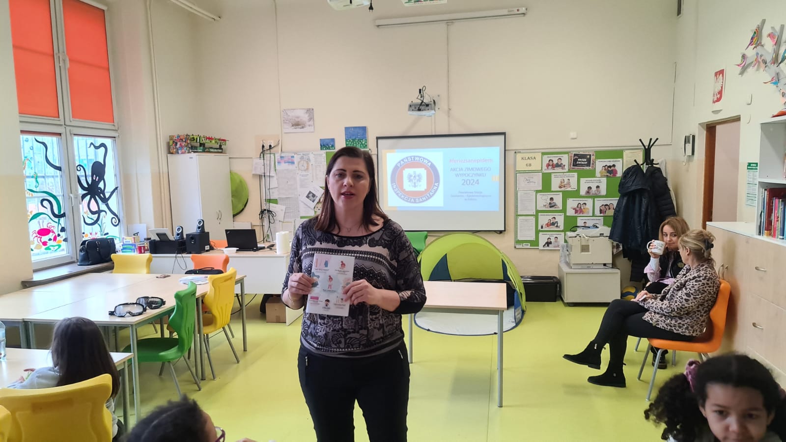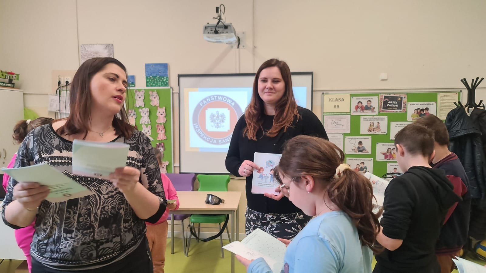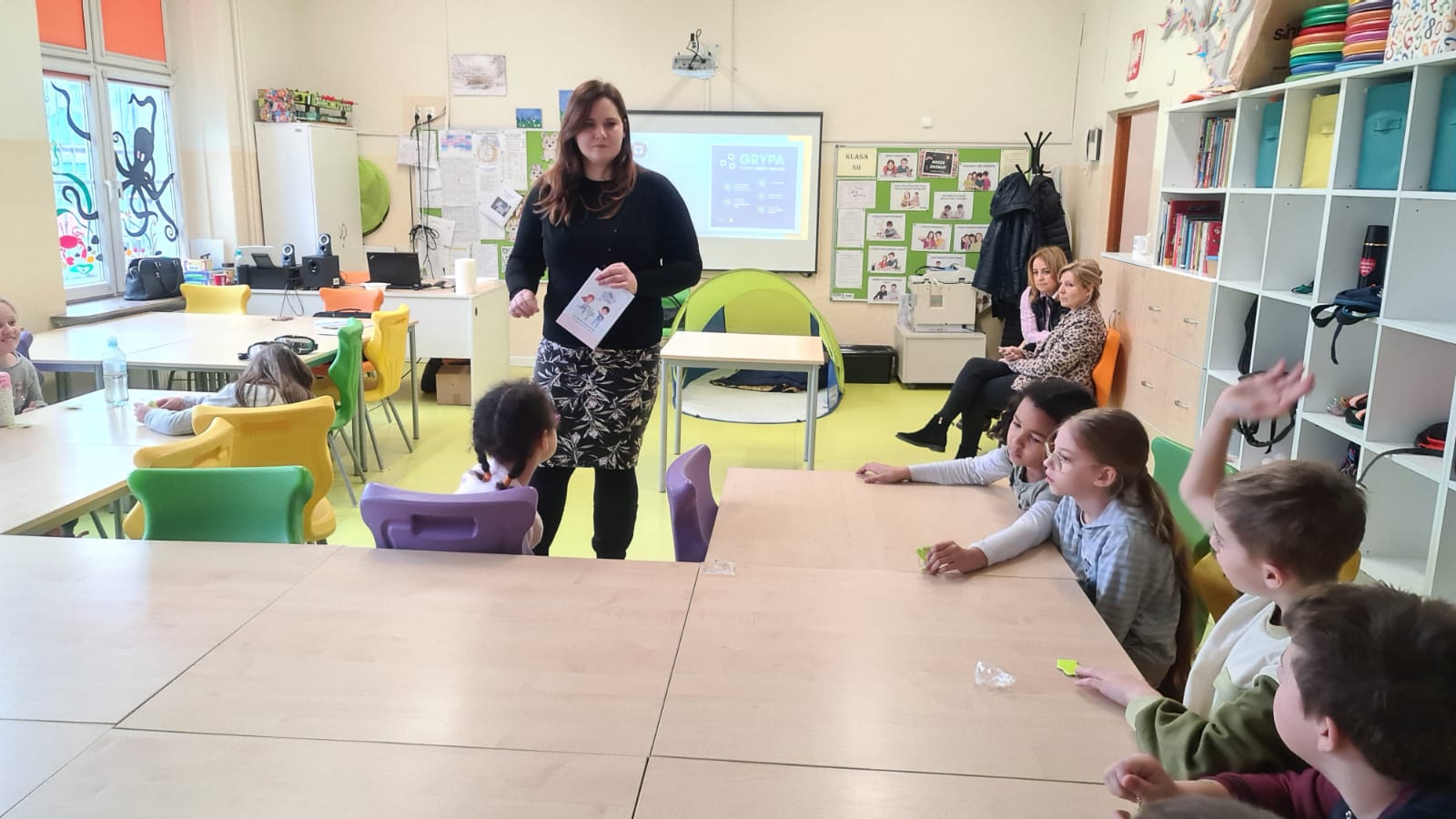 Na terenie Szkoły Podstawowej nr 1 w Kaliszu, 15 lutego 2024 roku pracownicy Powiatowej Stacji Sanitarno-Epidemiologicznej w Kaliszu z Sekcji Oświaty Zdrowotnej