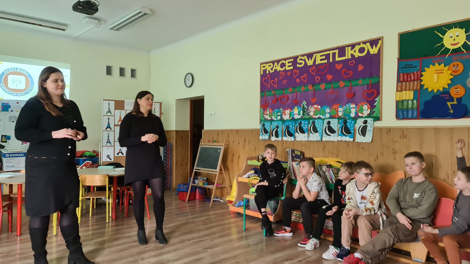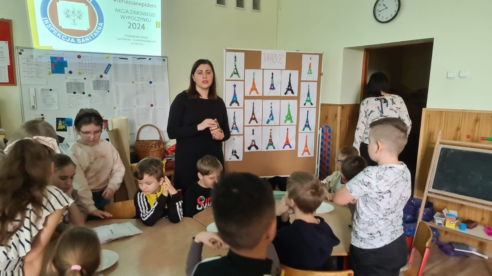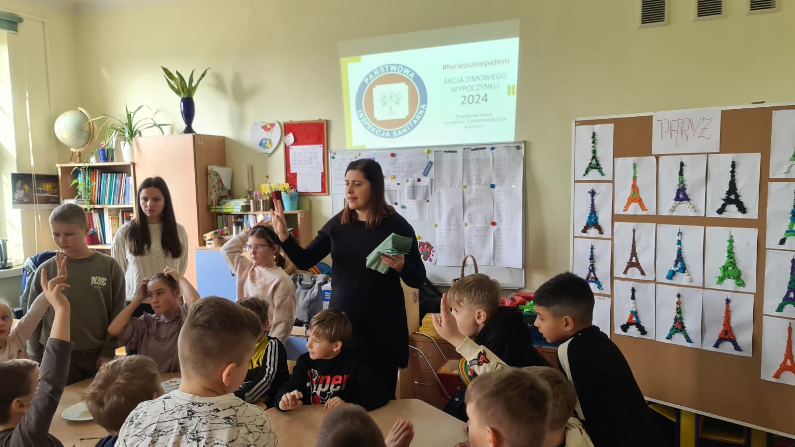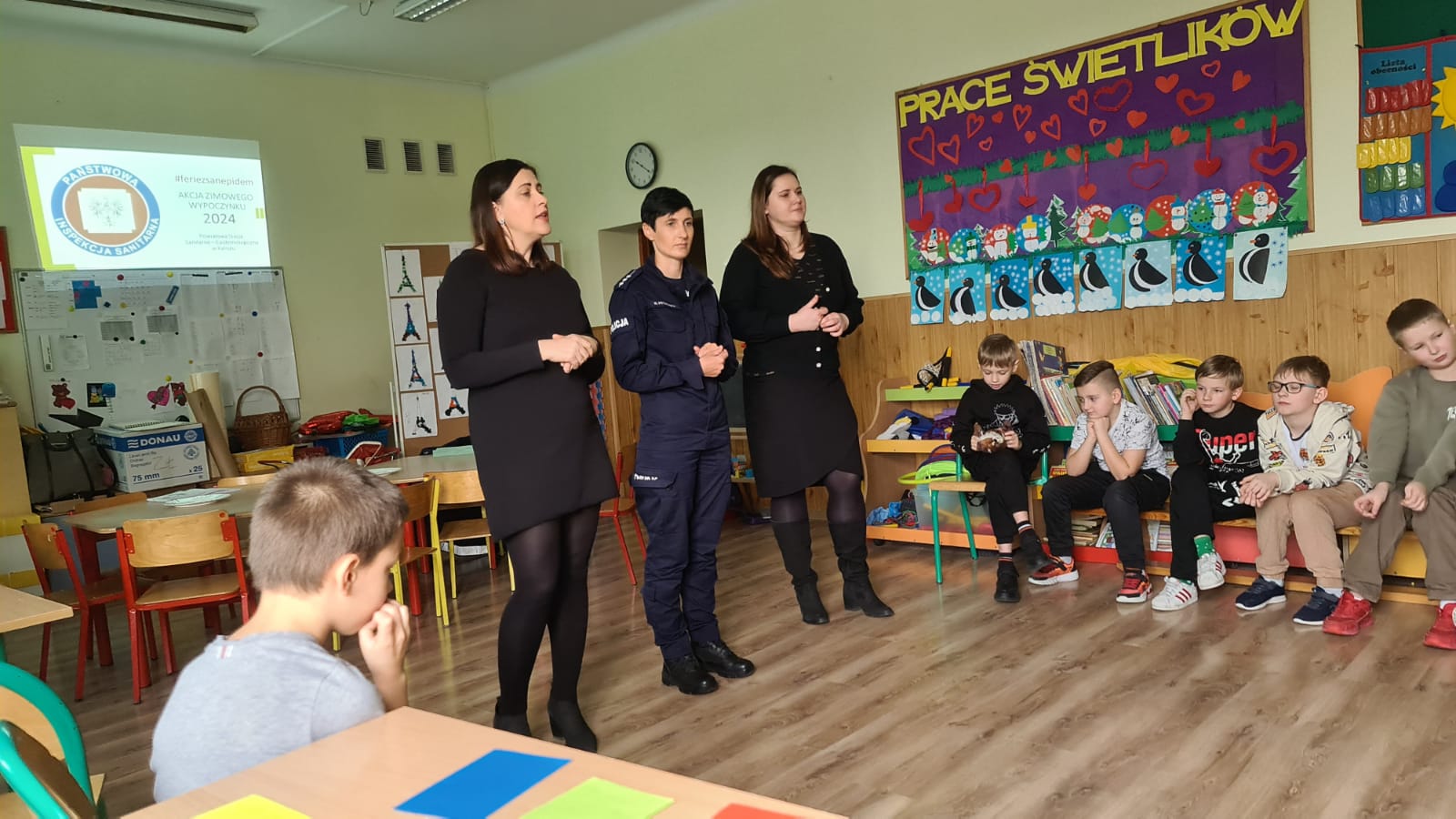 W ramach „Akcji Zimowego Wypoczynku”, w dniu 14 lutego 2024 roku, pracownicy Powiatowej Stacji Sanitarno-Epidemiologicznej w Kaliszu z Sekcji Oświaty Zdrowotnej i Promocji Zdrowia: Agnieszka Stępniak i Joanna Jaroma-Woźniak, we współpracy z funkcjonariuszem Komendy Miejskiej Policji w Kaliszu, na terenie Szkoły Podstawowej nr 12 przeprowadziły działania promujące bezpieczeństwo i zdrowy styl życia.