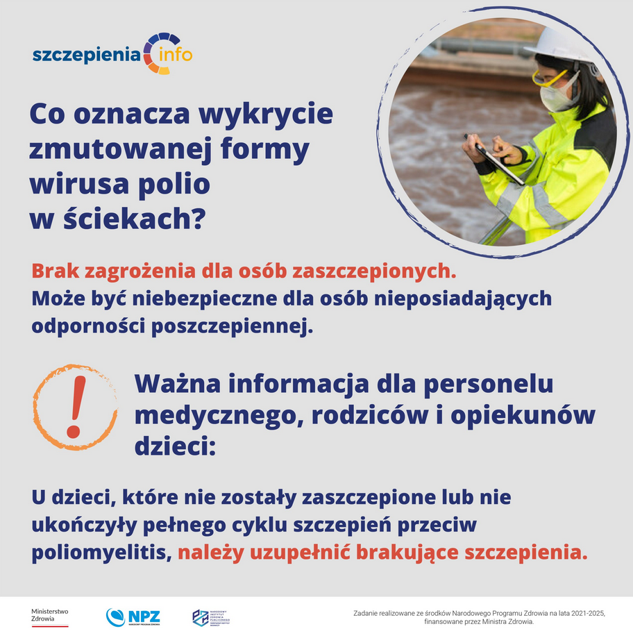 Apelujemy do personelu medycznego oraz rodziców i opiekunów dzieci, które nie zostały zaszczepione lub nie ukończyły pełnego cyklu szczepień przeciw polyomyelitis, o uzupełnienie brakujących szczepień. Szczepienie jest nieodpłatne dla wszystkich osób do 19. roku życia.