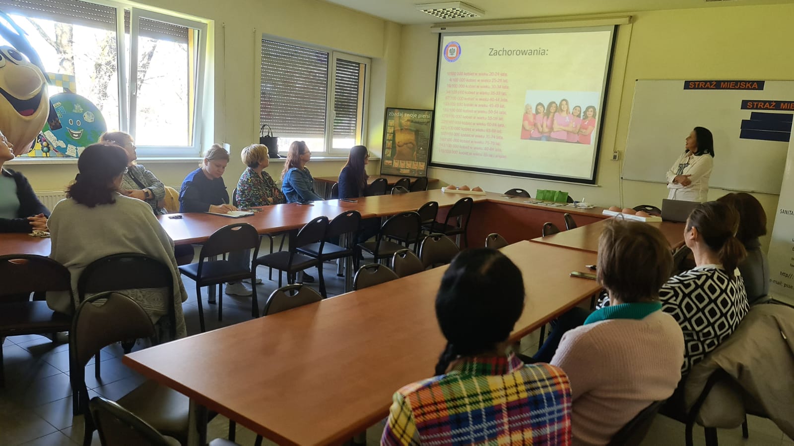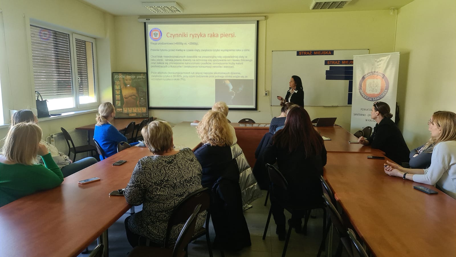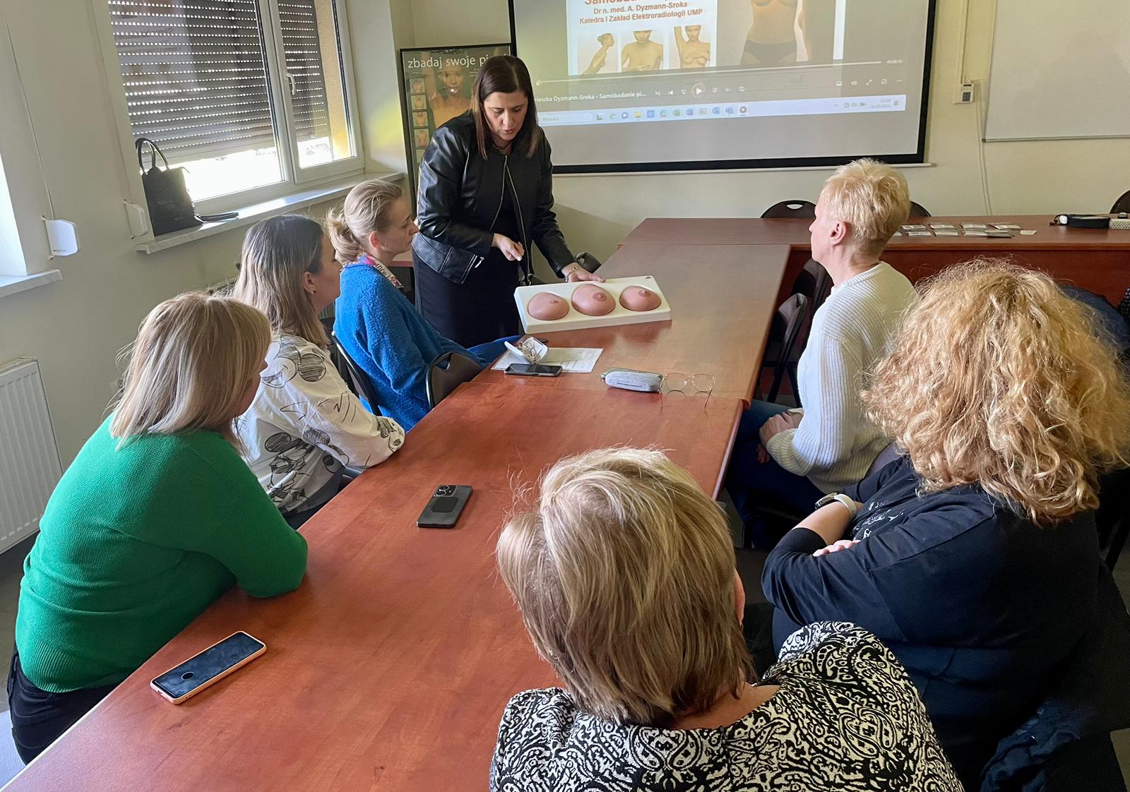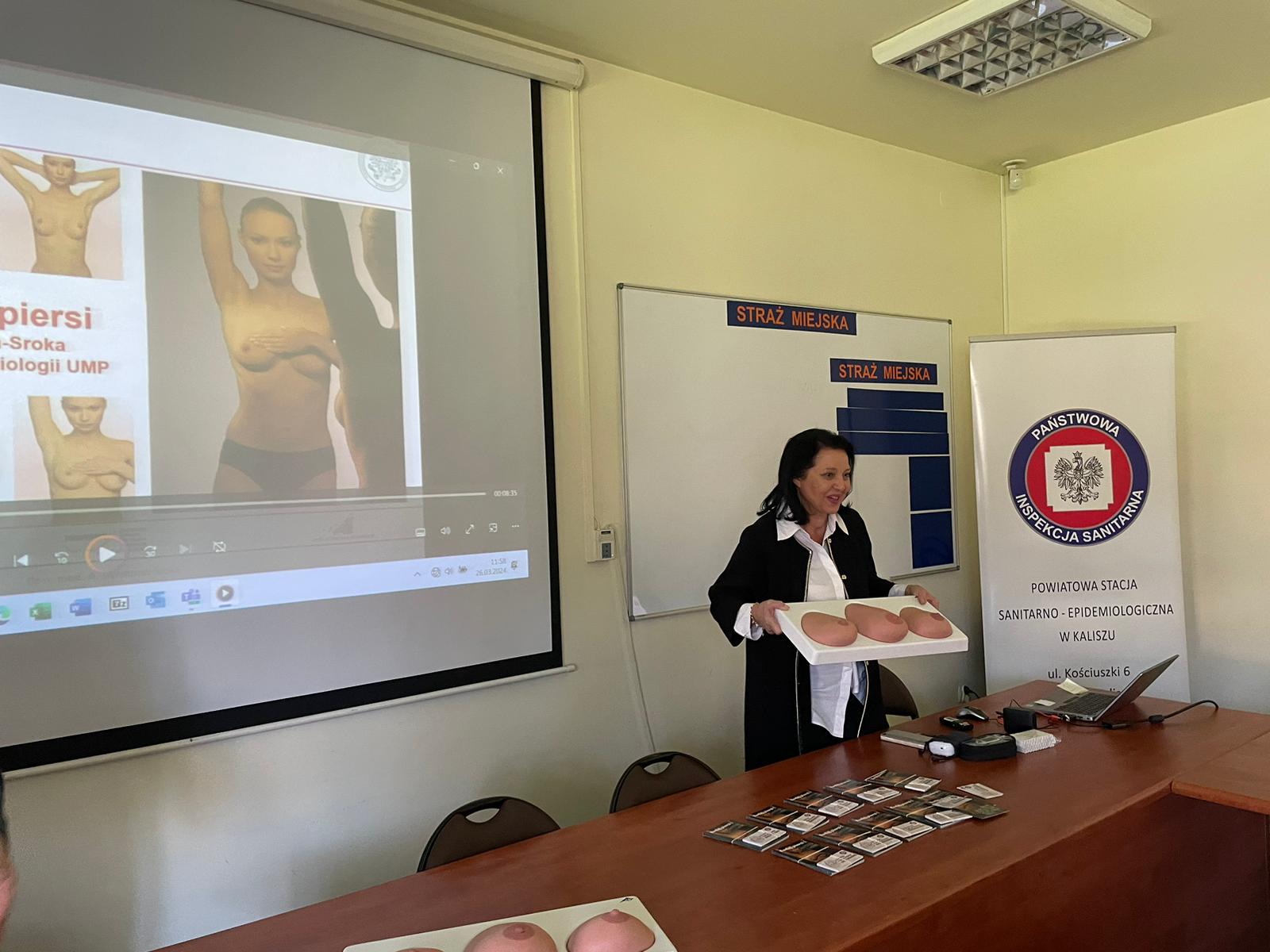 Kierownik Sekcji Oświaty Zdrowotnej i Promocji Zdrowia omówiła czynniki ryzyka zachorowania na raka piersi, zalecane działania profilaktyczne oraz statystykę zachorowań.