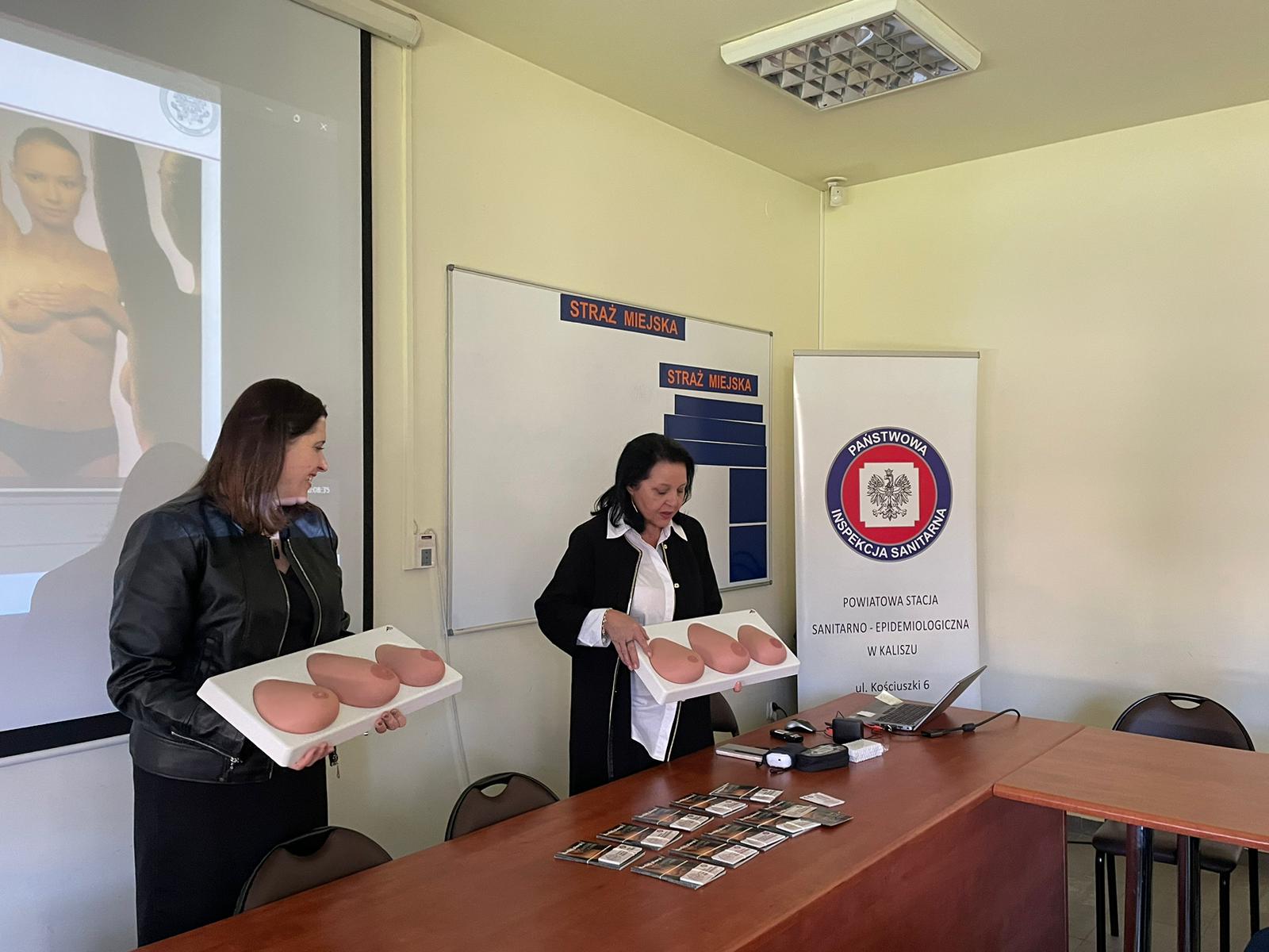 Wszystkie uczestniczki szkolenia skorzystały z nauki badania piersi z wykorzystaniem fantomów zakupionych przez Starostwo Powiatowe w Kaliszu.