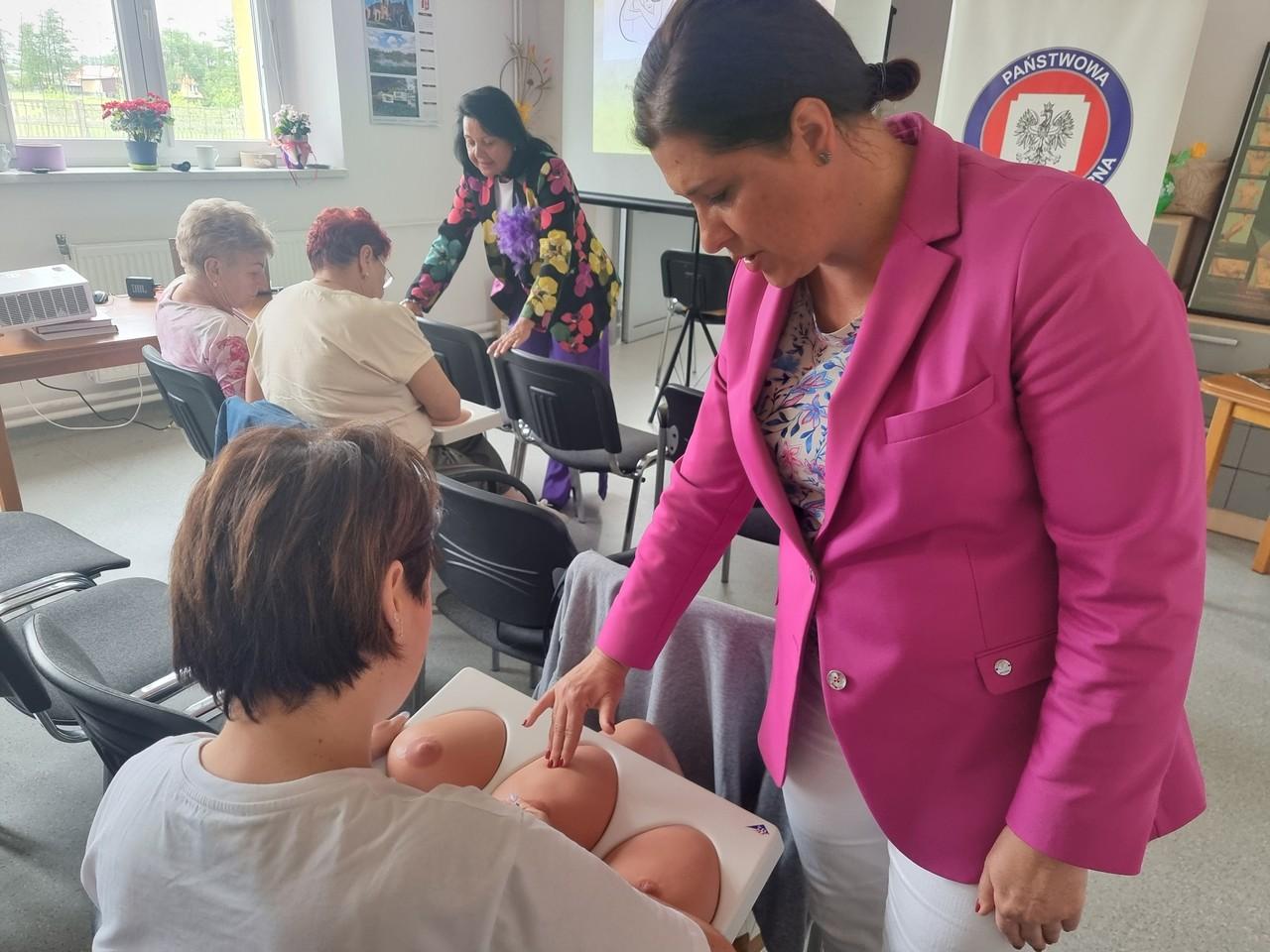 Wszyscy uczestnicy szkolenia skorzystali z nauki badania piersi z wykorzystaniem fantomów zakupionych przez Starostwo Powiatowe w Kaliszu.