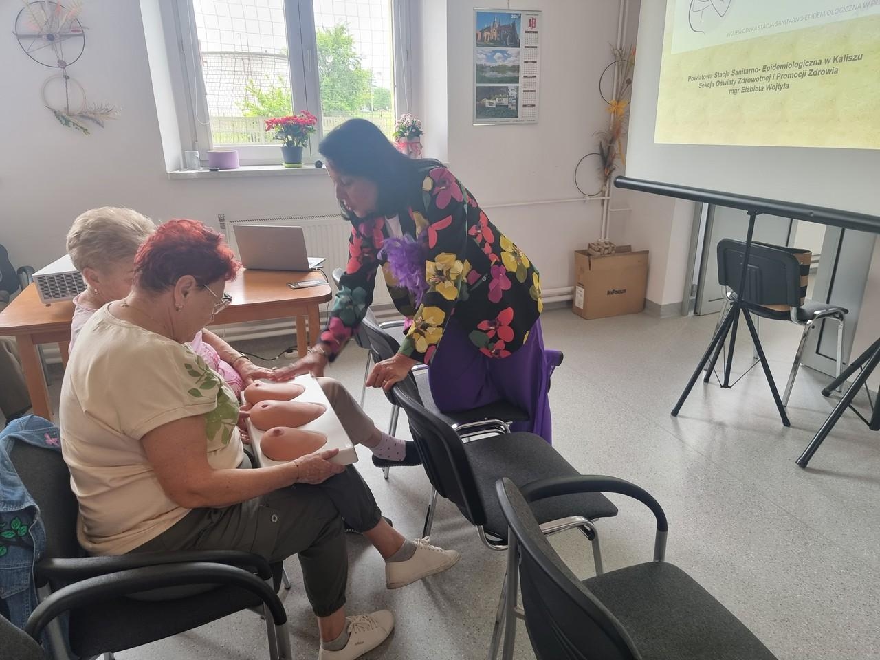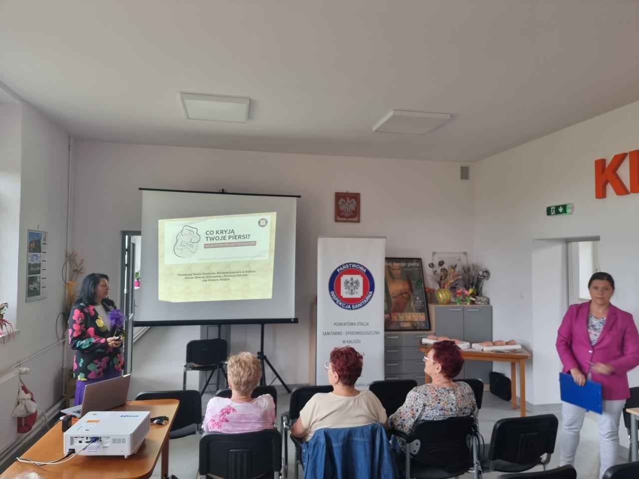 w Kaliszu: Elżbieta Wojtyła, Agnieszka Stępniak oraz Joanna Jaroma-Woźniak przeprowadziły szkolenie oraz zajęcia warsztatowe w ramach wojewódzkiego projektu edukacyjnego „Co kryją Twoje piersi?” wśród uczestników Klubu Senior + w Sierzchowie.