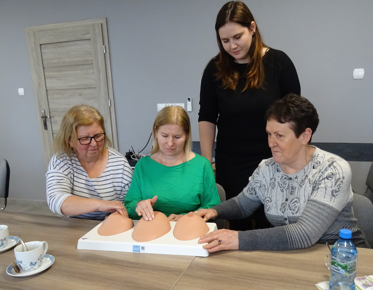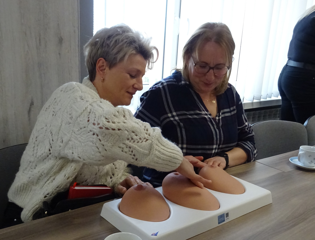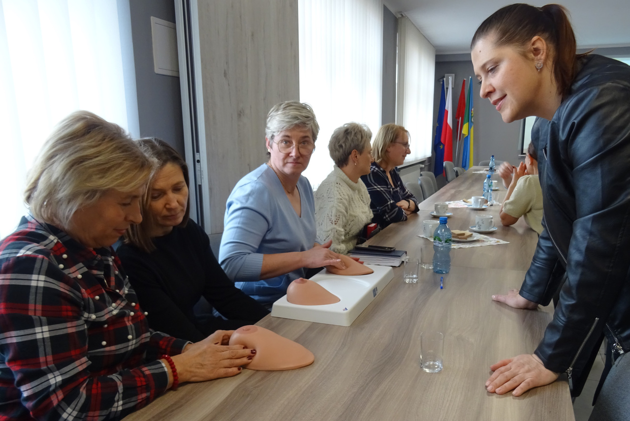 Pracownicy Sekcji OZ i PZ prowadzący szkolenie Elżbieta Wojtyła, Agnieszka Stępniak oraz Joanna Jaroma – Woźniak przedstawili instruktaż prawidłowego samobadania piersi. Poinformowano również obecnych o miejscach w których można wykonać bezpłatną mammografię.