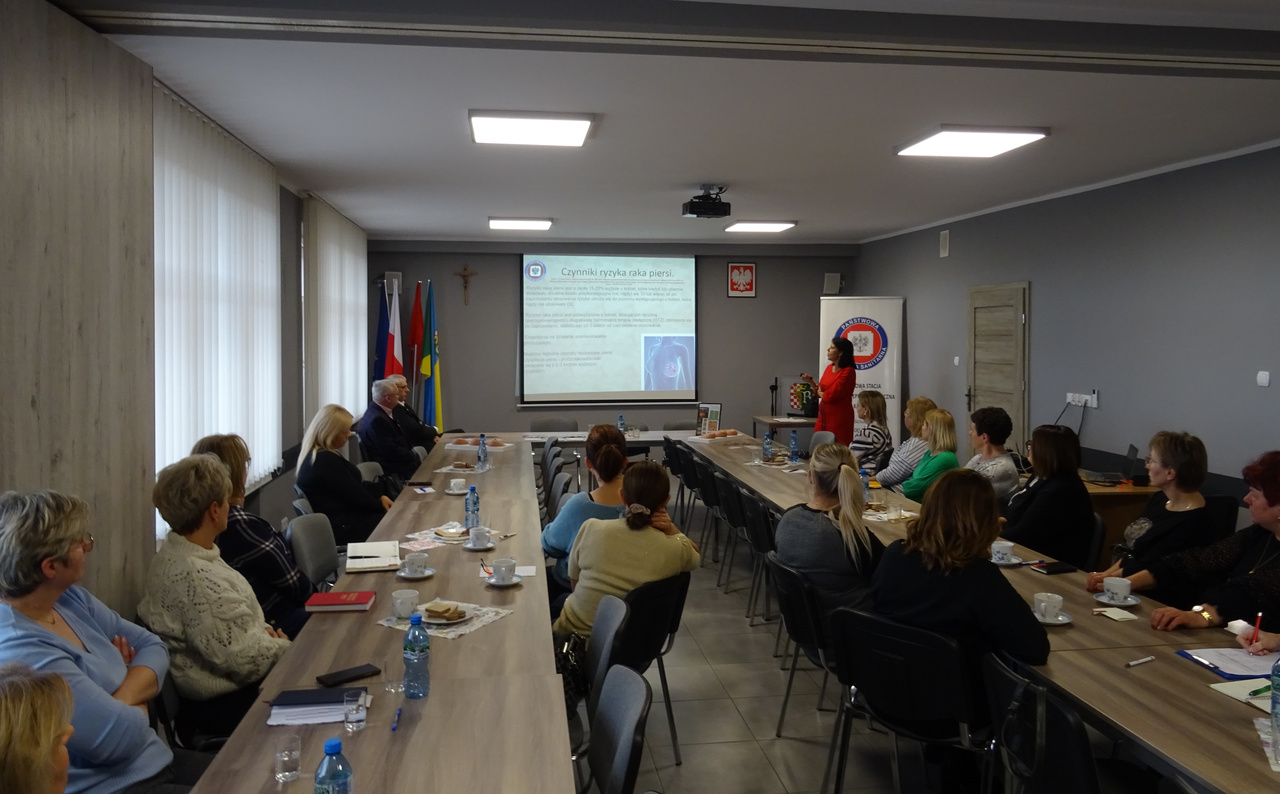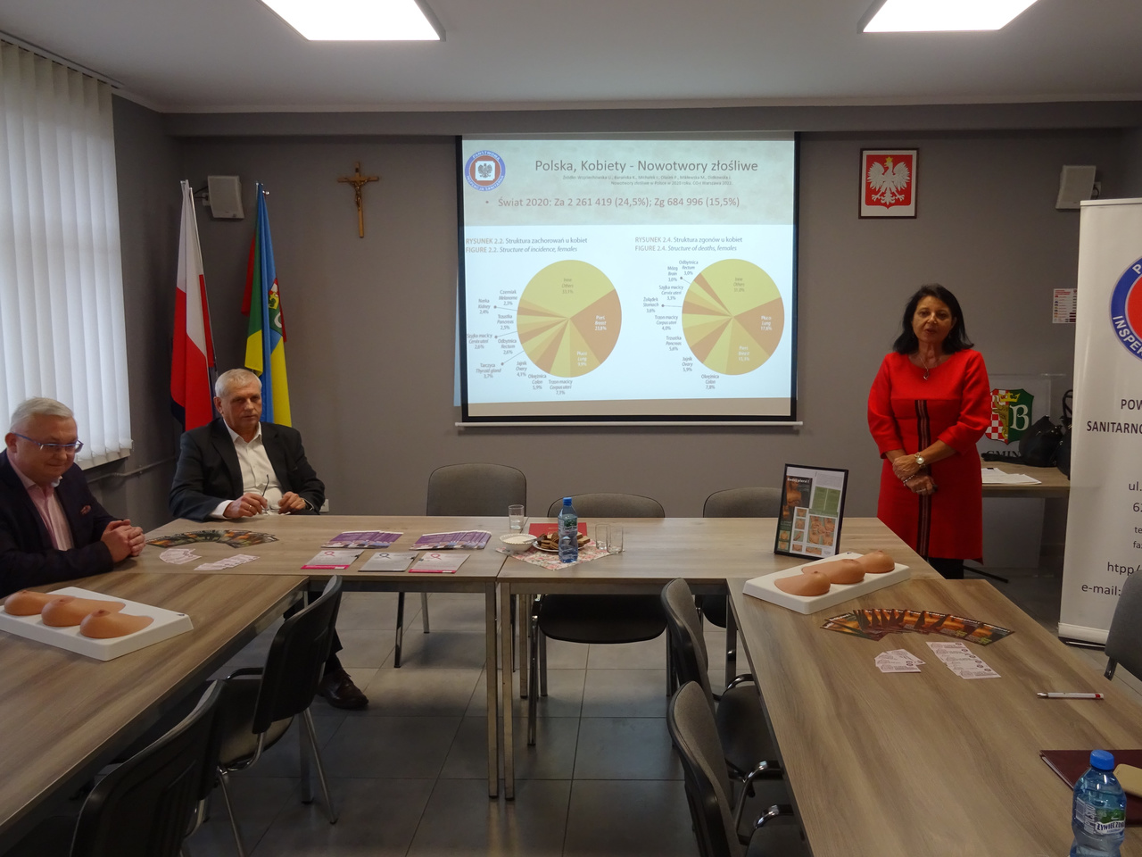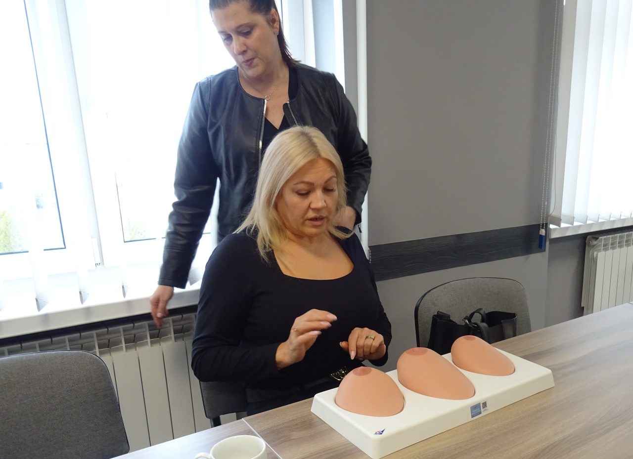 Pracownicy Sekcji OZ i PZ prowadzący szkolenie Elżbieta Wojtyła, Agnieszka Stępniak oraz Joanna Jaroma – Woźniak przedstawili instruktaż prawidłowego samobadania piersi. Poinformowano również obecnych o miejscach w których można wykonać bezpłatną mammografię.