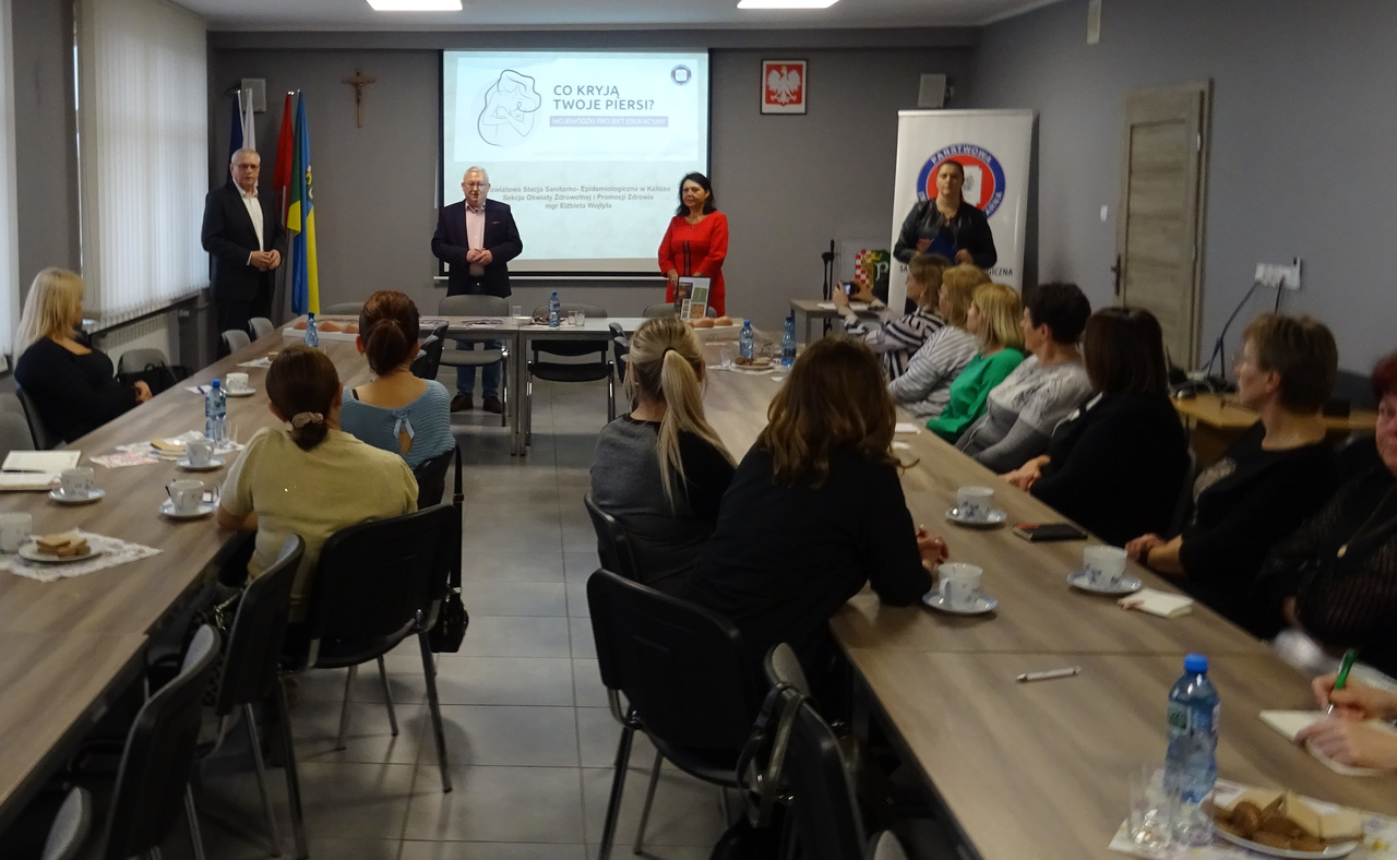 Dyrektor PSSE w Kaliszu Marek Stodolny powitał uczestniczki szkolenia, przedstawił główne informacje o projekcie i oddał głos Kierownikowi Sekcji OZ i PZ Elżbiecie Wojtyła, która poinformowała, iż szkolenie odbywa się w ramach wojewódzkiego projektu „Co kryją twoje piersi”, oraz przedstawiła prezentację na temat profilaktyki raka piersi (prewencji oraz badań przesiewowych).