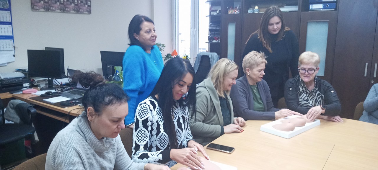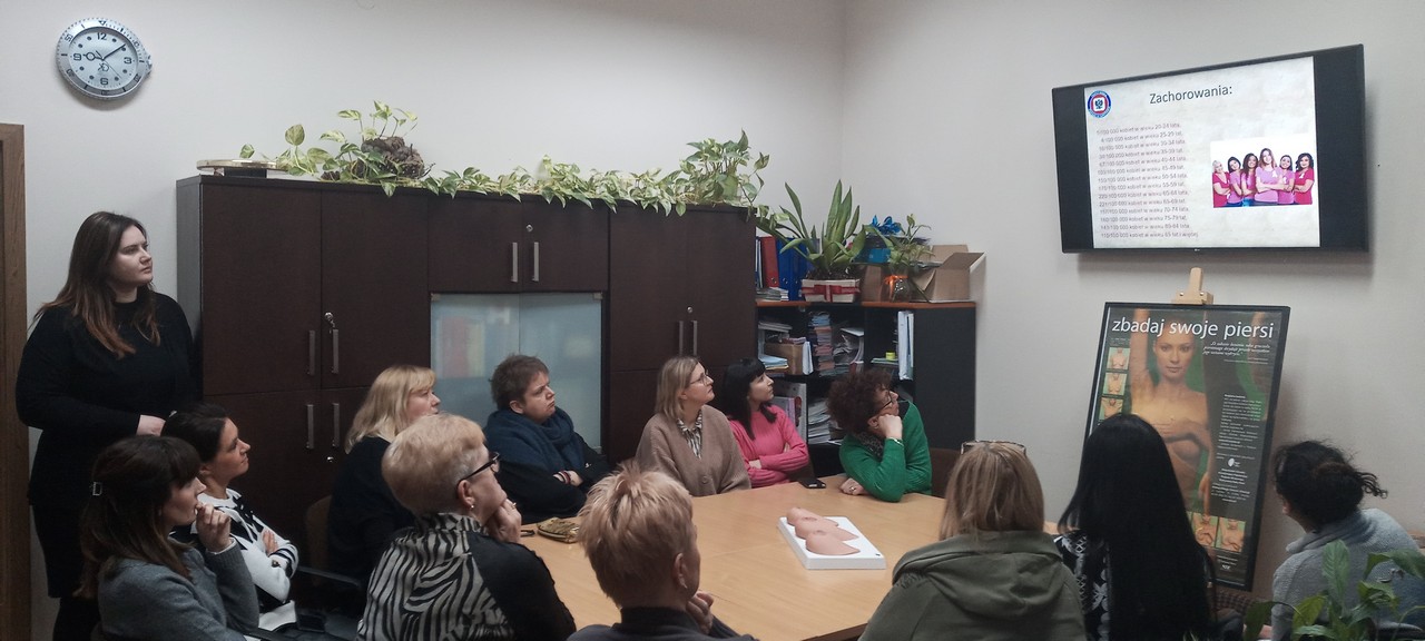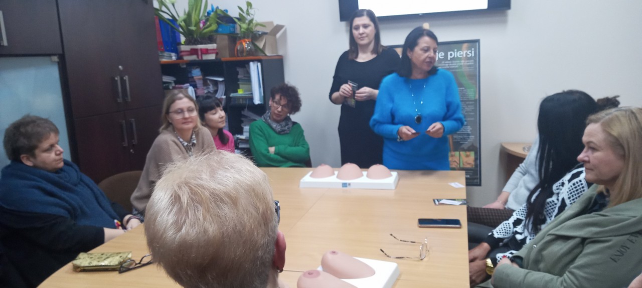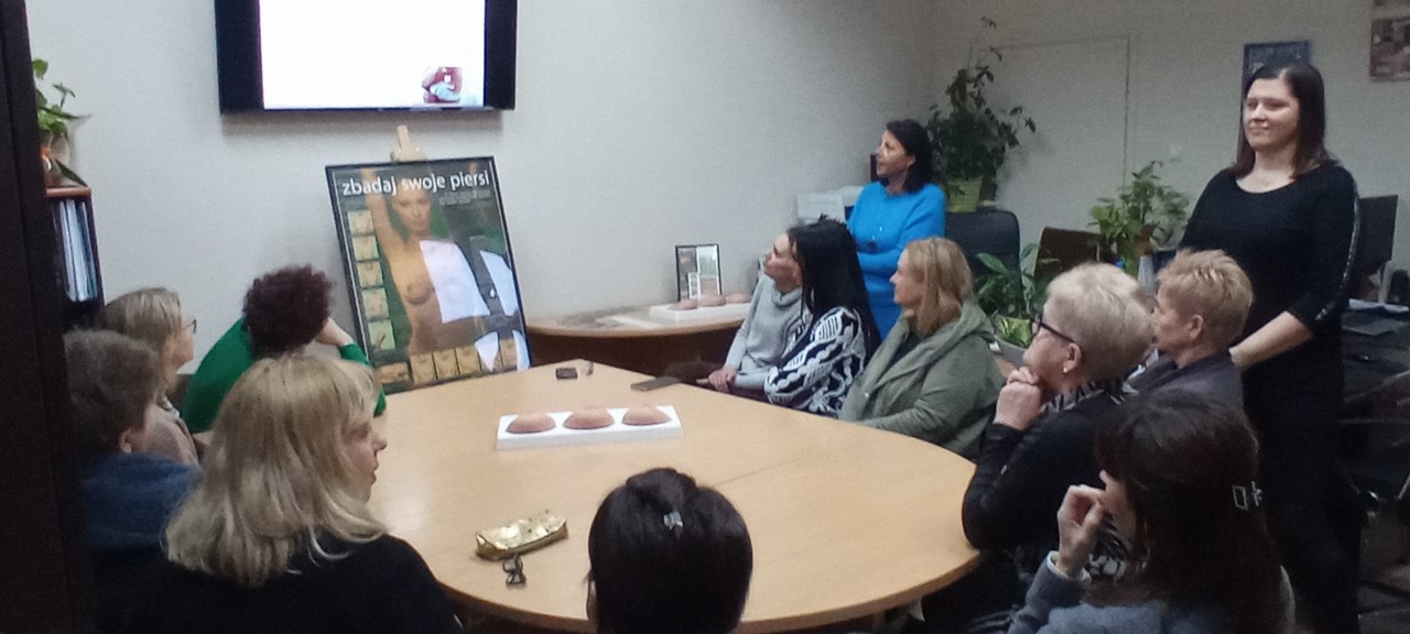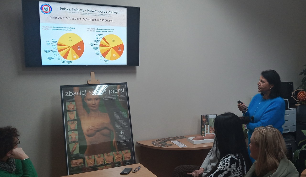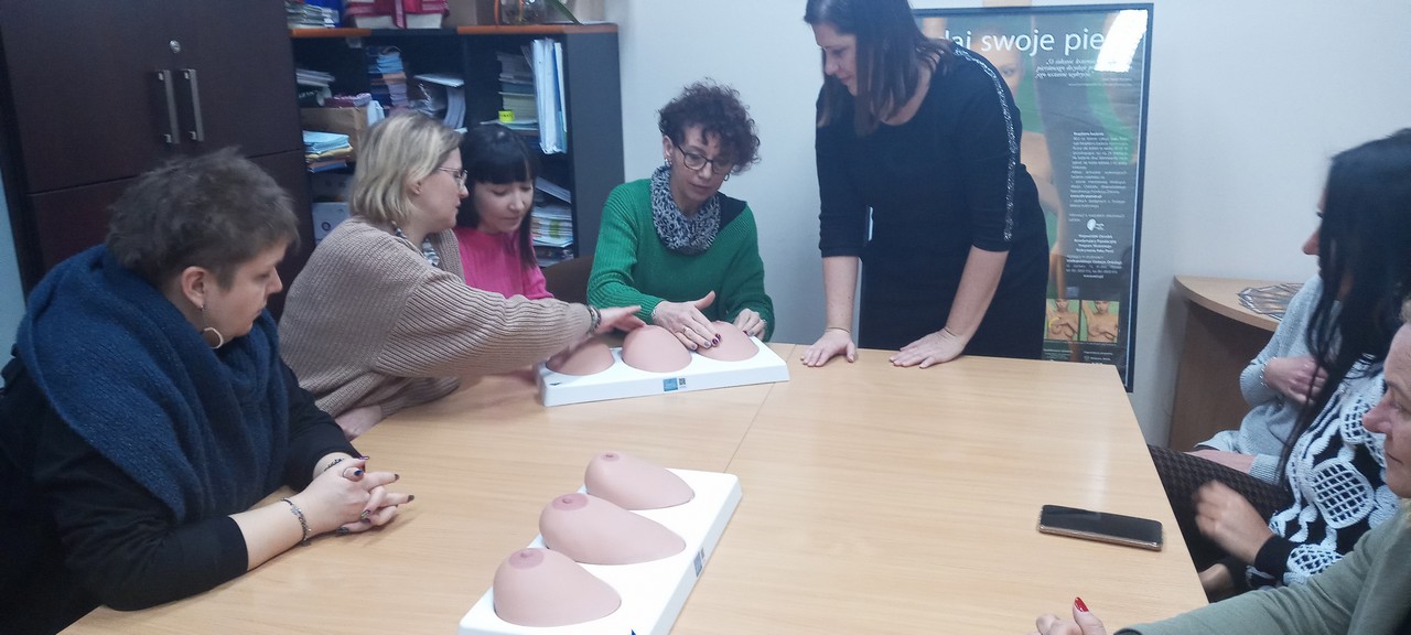 Wyświetlono filmy i kampanie edukacyjne. Następnie pracownicy Sekcji OZiPZ Agnieszka Stępniak i Joanna Jaroma-Woźniak przy wykorzystaniu modeli, przeprowadziły warsztaty samobadania piersi.