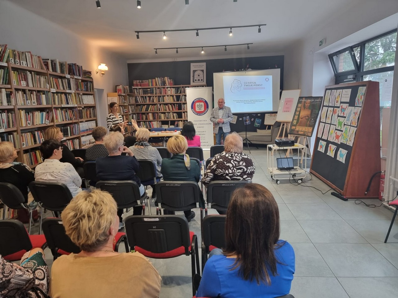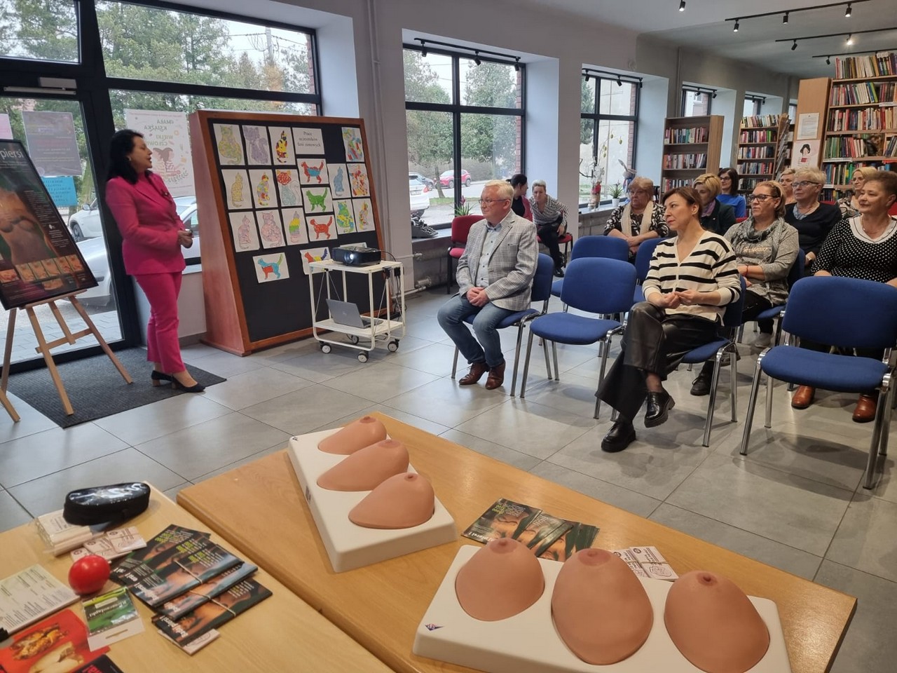 Z wykorzystaniem prezentacji multimedialnej omówione zostały działania profilaktyczne, czynniki ryzyka, a także statystyka zachorowań na raka piersi.