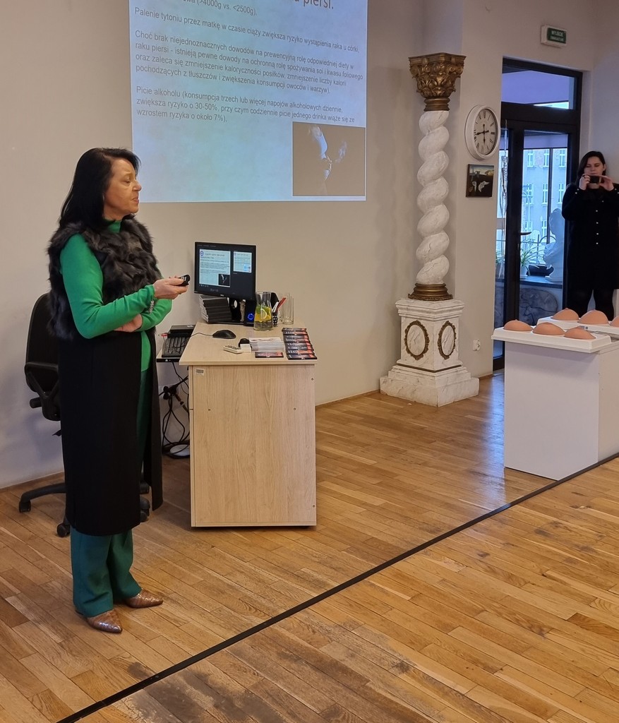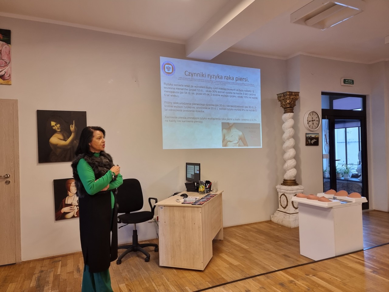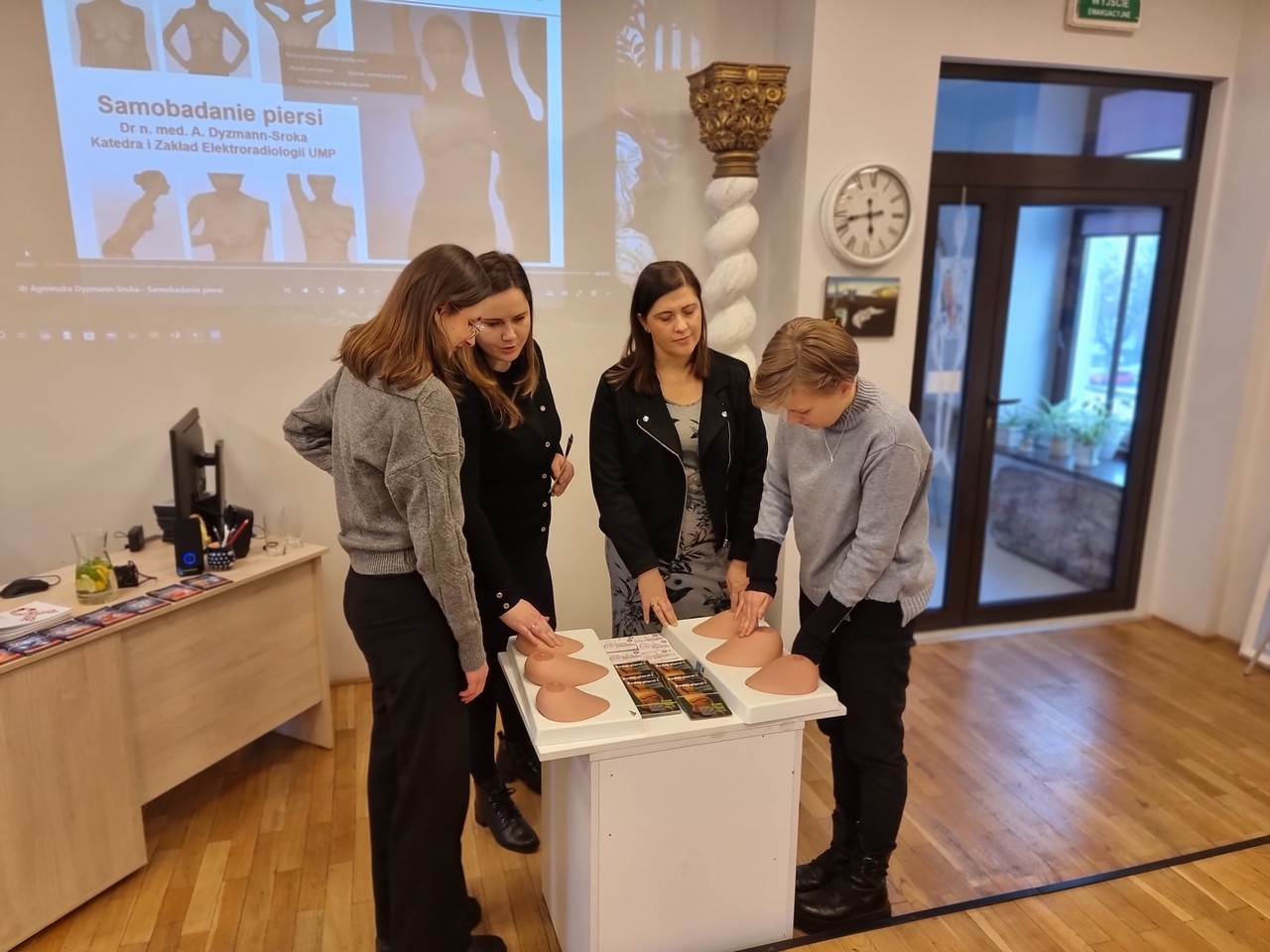 Wyświetlono filmy i kampanie edukacyjne. Następnie pracownicy Sekcji OZiPZ Agnieszka Stępniak i Joanna Jaroma-Woźniak przy wykorzystaniu modeli, przeprowadziły warsztaty samobadania piersi.