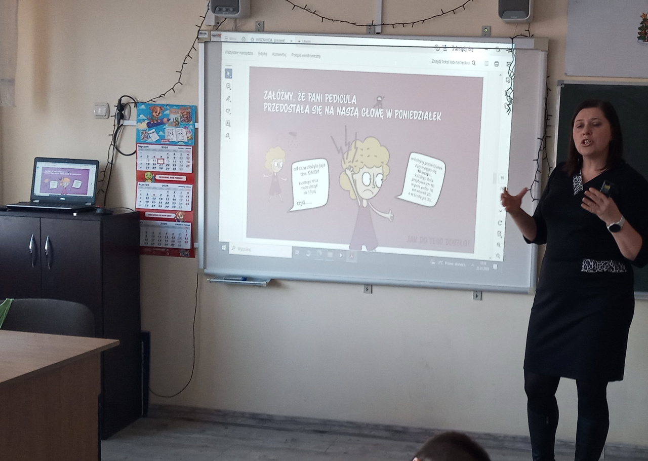 Uczniowie klas II i III dowiedzieli się, jak prawidłowo dbać o higienę i pielęgnację włosów oraz czego unikać, aby nie zarazić się wszawicą. Zajęcia odbywały się w formie prezentacji, pogadanek, zagadek i dyskusji – dzięki temu dzieci w przystępny sposób poznały zasady profilaktyki.