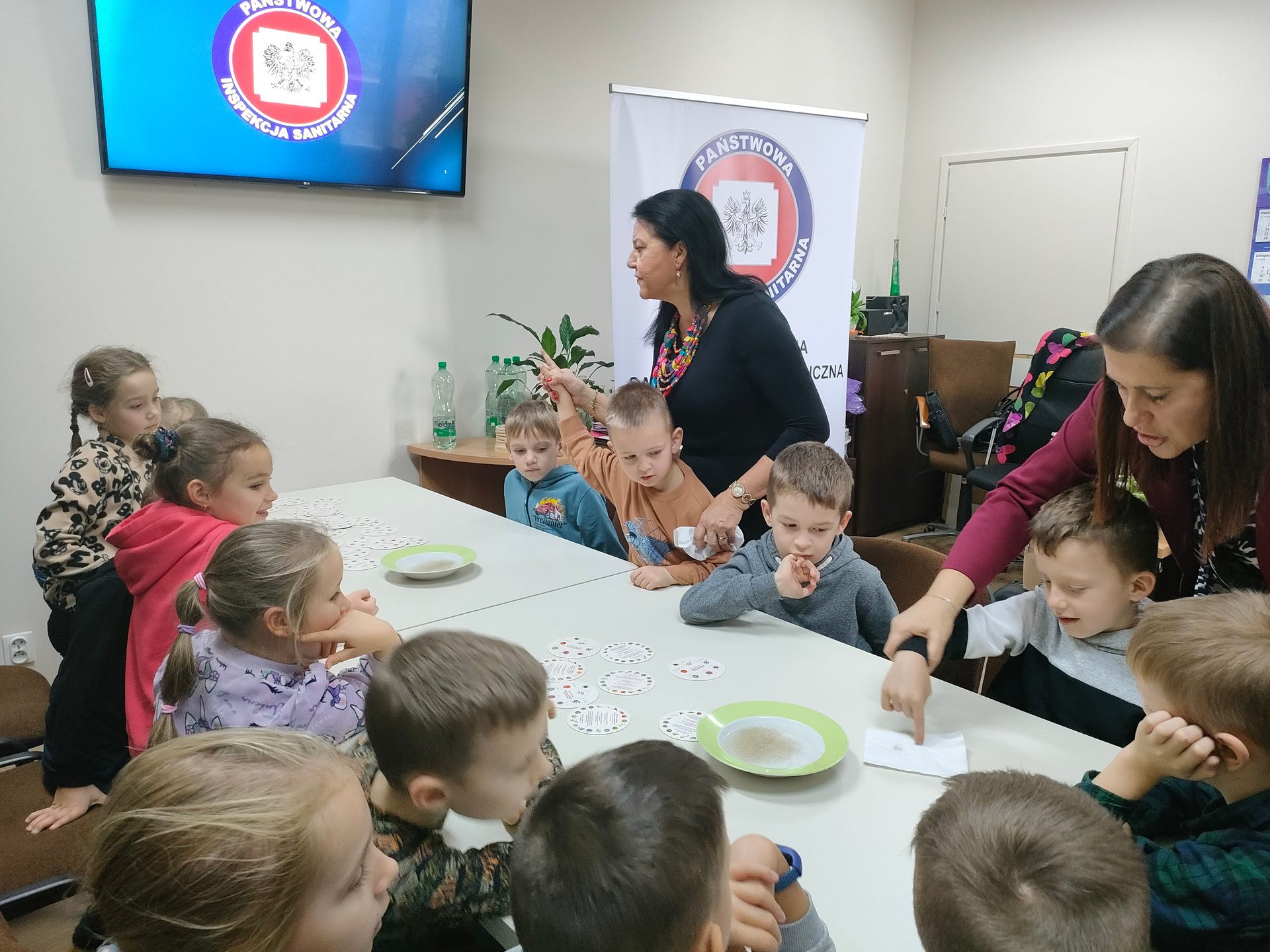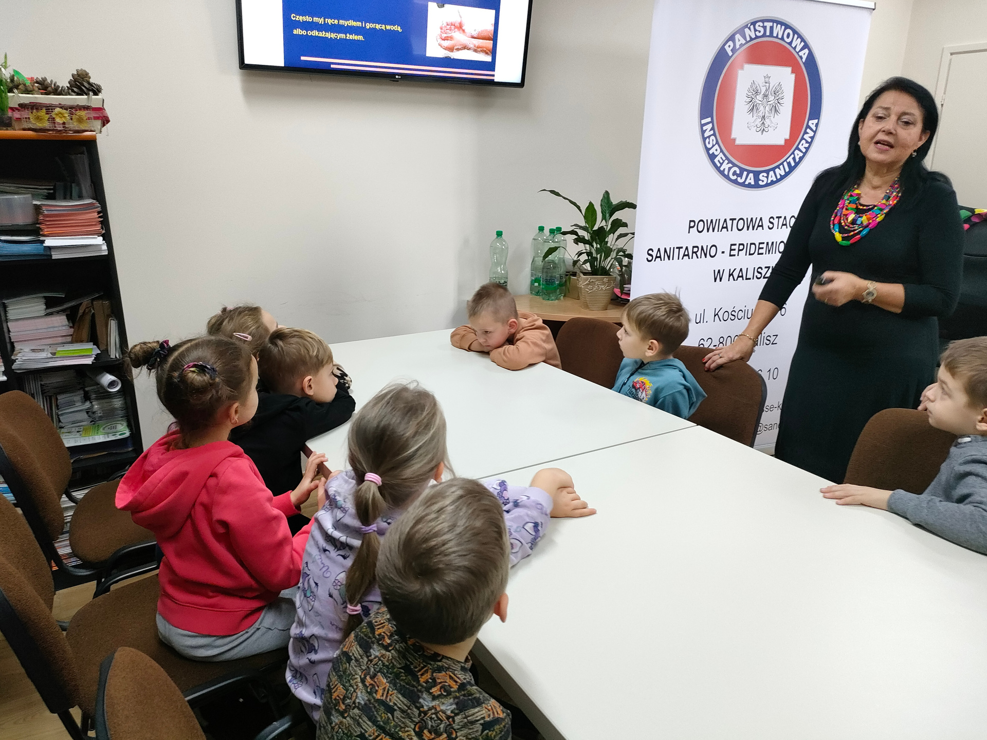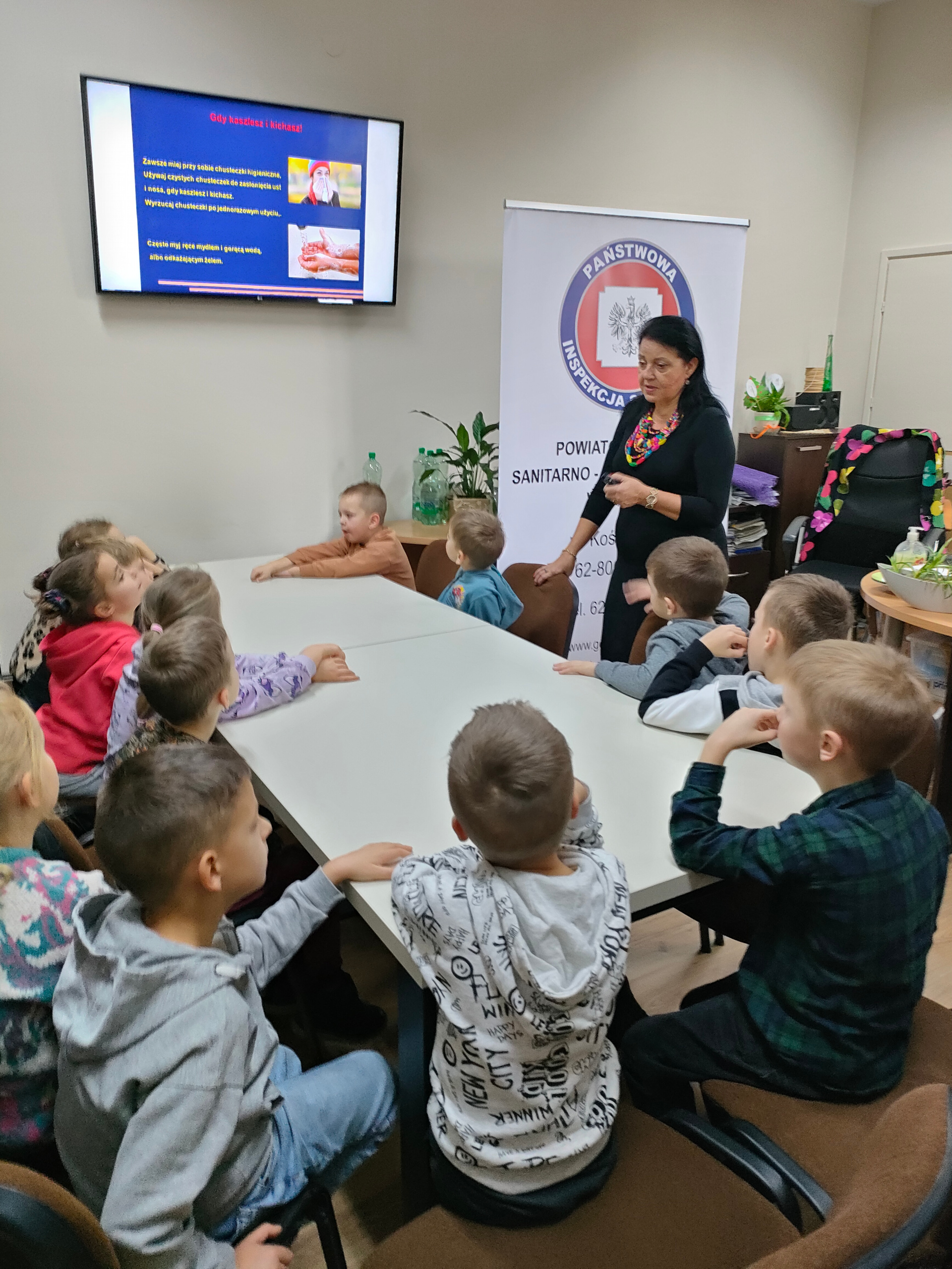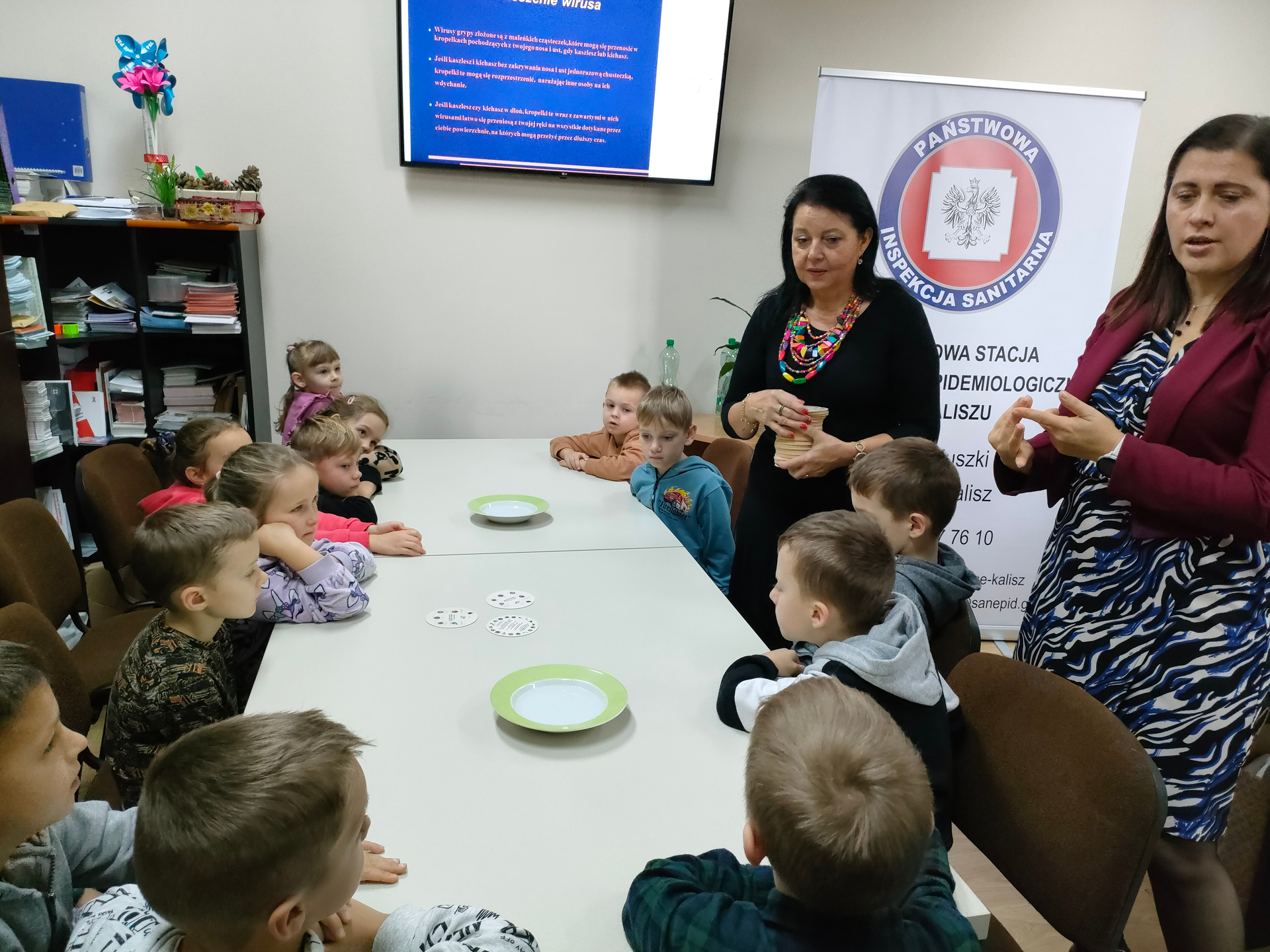 15 listopada gościliśmy przedszkolaków z Publicznego Przedszkola JUSTYNKA W Stawiszynie wraz z opiekunami, dla których pracownicy Sekcji Oświaty Zdrowotnej i Promocji Zdrowia Powiatowej Stacji Sanitarno-Epidemiologicznej w Kaliszu przeprowadzili zajęcia dotyczące profilaktyki grypy.