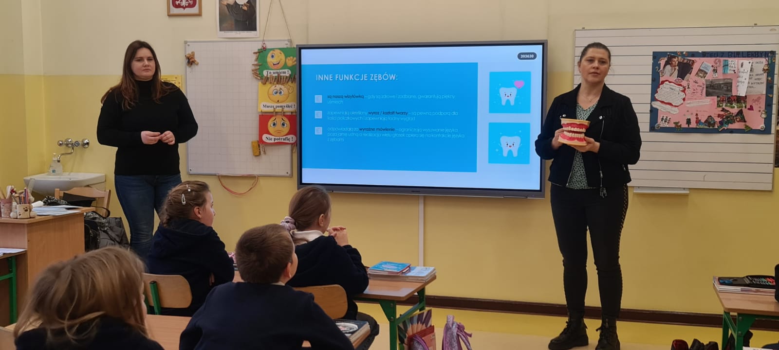 Pracownicy Sekcji Oświaty Zdrowotnej i Promocji Zdrowia Powiatowej Stacji Sanitarno-Epidemiologicznej w Kaliszu Agnieszka Stępniak i Joanna Jaroma-Woźniak, w ramach wojewódzkiego projektu edukacyjnego „Mam zdrowe zęby!” przeprowadzili kolejne zajęcia dotyczące higieny jamy ustnej.