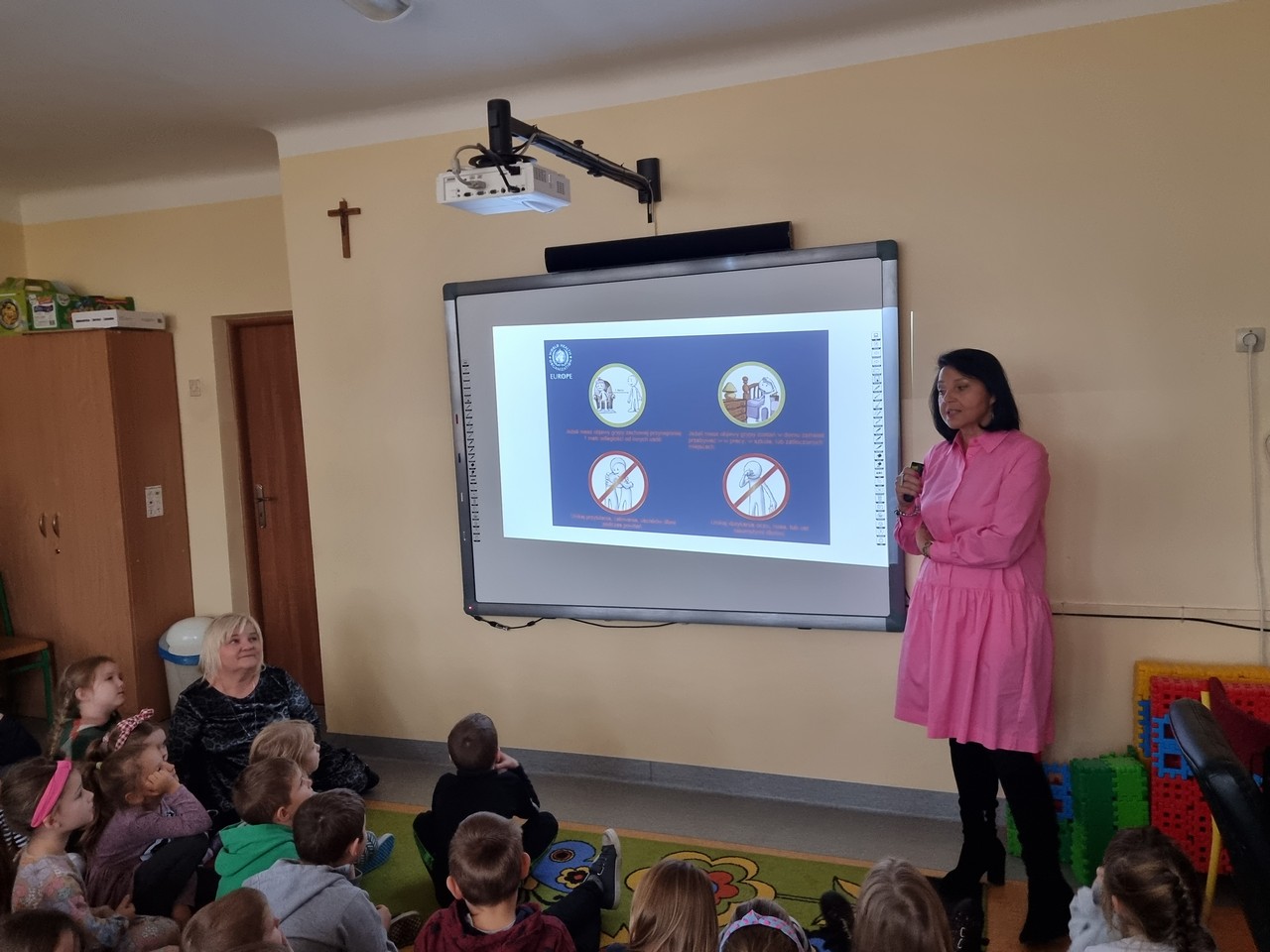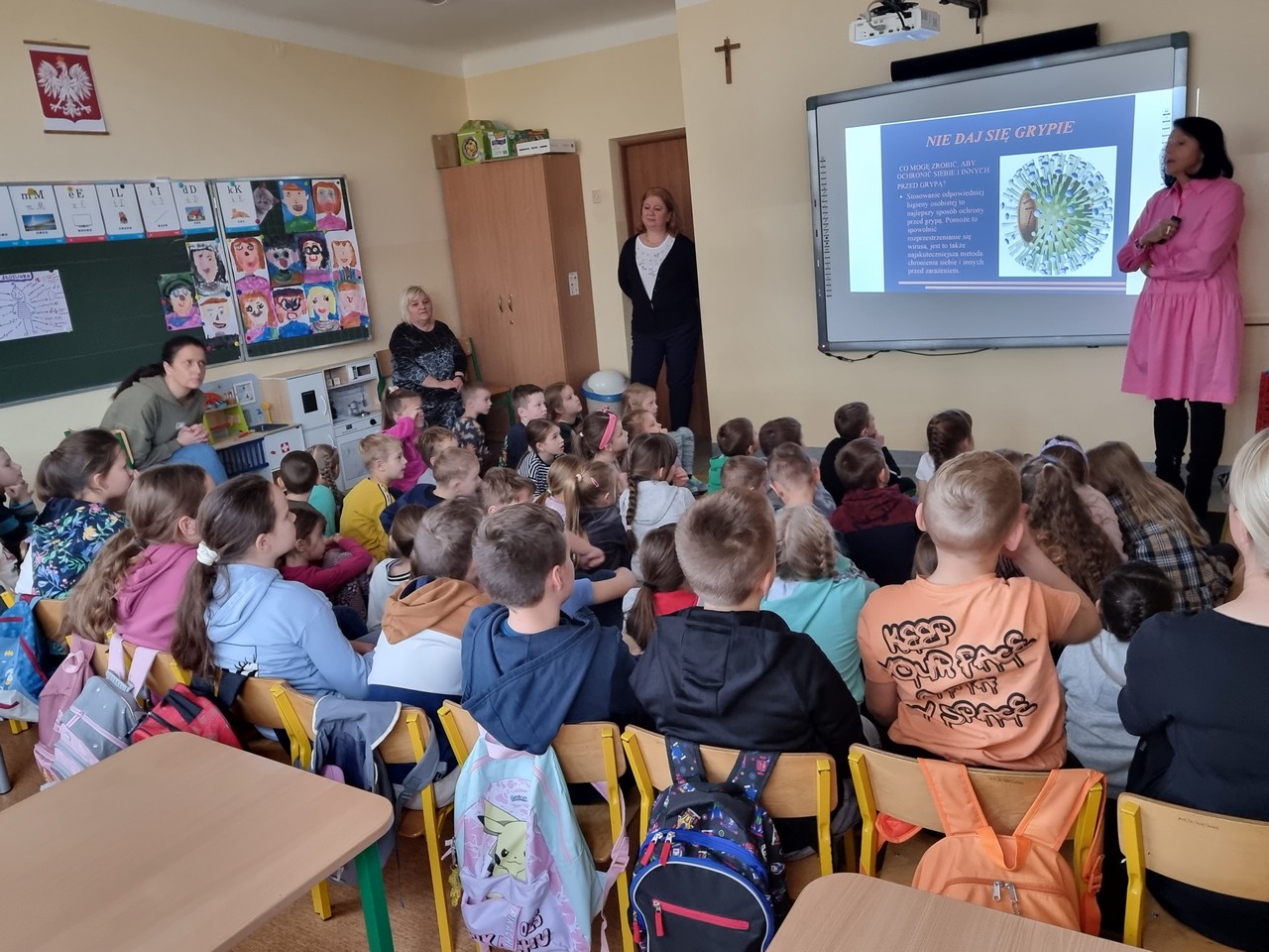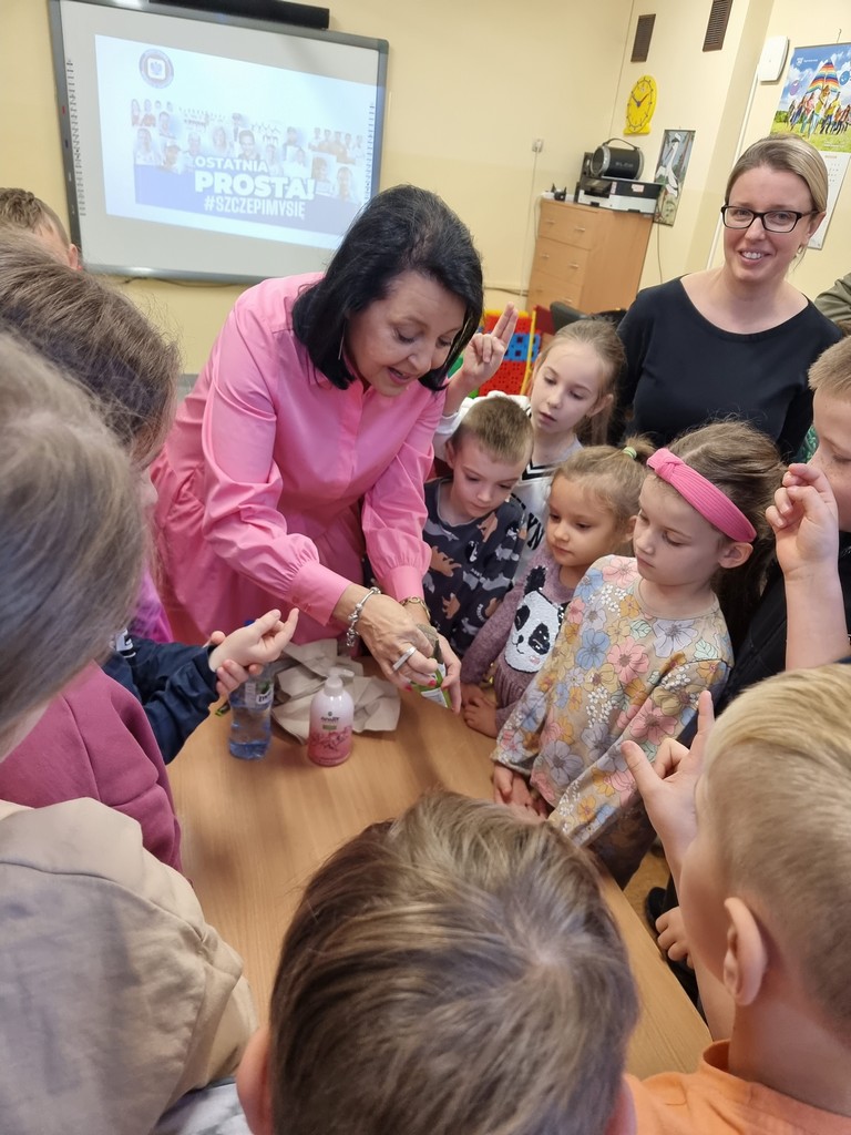 Dzieciom przedstawiono prezentację dotyczącą profilaktyki grypy, o jakich zasadach i nawykach należy pamiętać by ustrzec się przed zachorowaniem. Przypomniano, jak proste czynności higieniczne mogą uchronić nas przed zachorowaniem i wzmocnić naszą odporność.