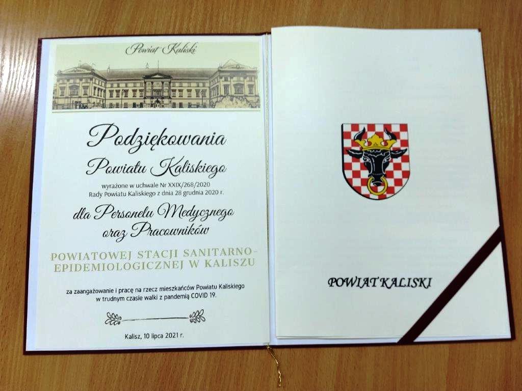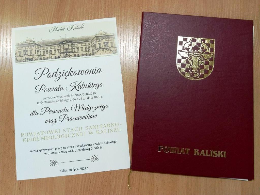 Powiatowa Stacja Sanitarno- Epidemiologiczna w Kaliszu również otrzymała „Podziękowania Powiatu Kaliskiego” wyrażone w specjalnej uchwale Rady Powiatu dla pracowników Powiatowej Stacji Sanitarno- Epidemiologicznej w Kaliszu.