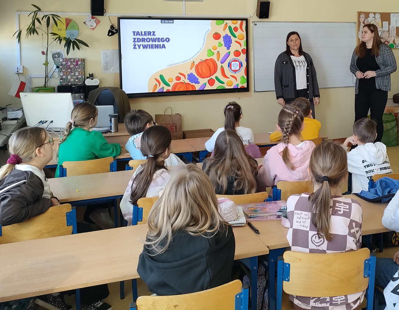 W dniu 18 marca 2025 roku pracownicy Sekcji Oświaty Zdrowotnej i Promocji Zdrowia z Powiatowej Stacji Sanitarno-Epidemiologicznej w Kaliszu – Agnieszka Stępniak i Joanna Jaroma -Woźniak przeprowadzili kolejne zajęcia edukacyjne w ramach wojewódzkiego projektu edukacyjnego „Talerz zdrowego żywienia”.