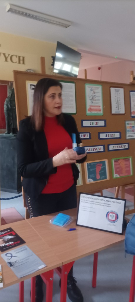 W dniu 17 listopada 2023 r. na terenie Zespołu Szkół Ponadpodstawowych w Kaliszu przy ul. Rzemieślniczej w ramach obchodów Światowego Dnia Rzucania Palenia pracownik Sekcji Oświaty Zdrowotnej i Promocji Zdrowia Powiatowej Stacji Sanitarno-Epidemiologicznej w Kaliszu przeprowadził działania mające na celu zachęcenie palaczy do rzucenia palenia.
