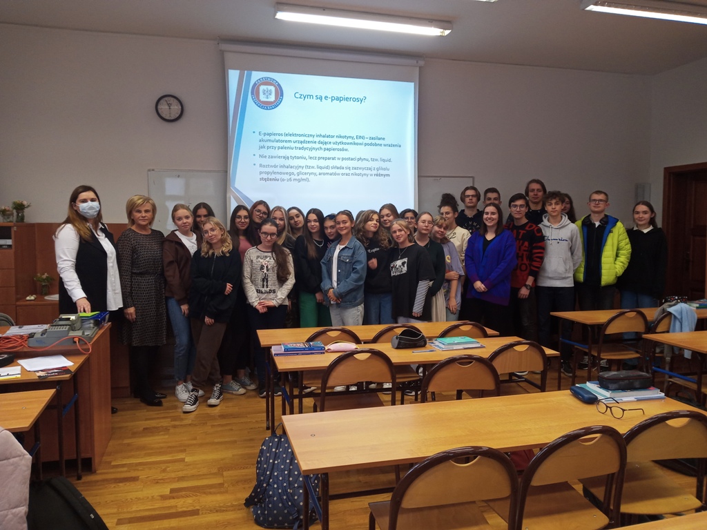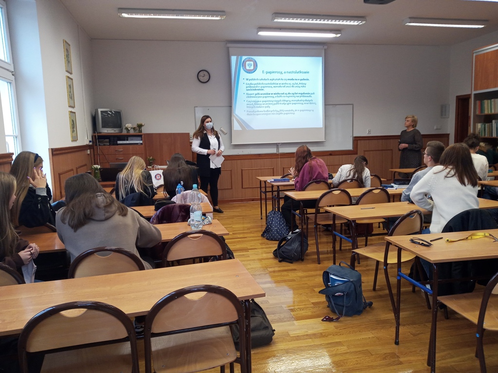 18 października 2021r. pracownik Sekcji Oświaty Zdrowotnej i Promocji Zdrowia – młodszy asystent Joanna Jaroma- Woźniak, przeprowadziła szkolenie dla uczniów I Liceum Ogólnokształcącego im. Adama Asnyka w Kaliszu. Tematem spotkania była szkodliwość palenia papierosów, inhalowania e-papierosów oraz innych systemów podgrzewających tytoń. Uczniowie zostali zapoznani z historią palenia, negatywnym wpływem nikotyny i innych składników papierosów a także e-papierosów na organizm człowieka. Omówiono szkody zdrowotne, społeczne i ekonomiczne.