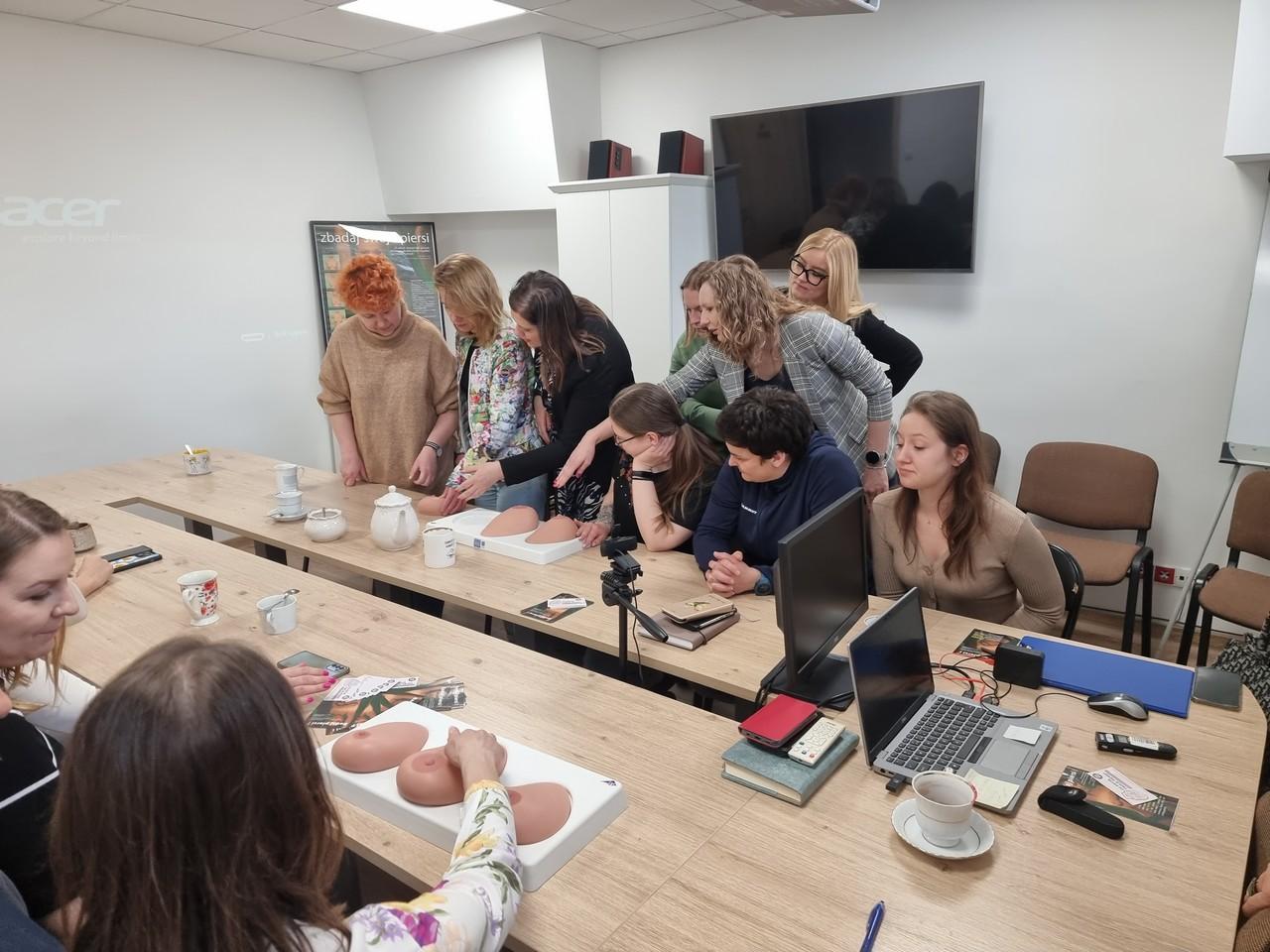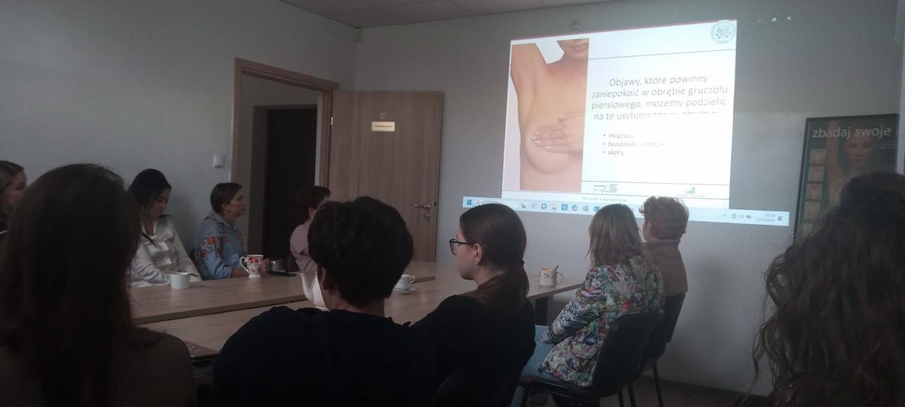 Następnie część teoretyczną składającą się z wykładu i projekcji filmów edukacyjnych poprowadziła kierownik sekcji Elżbieta Wojtyła. Omówione zostały m.in. czynniki ryzyka, działania profilaktyczne oraz statystyka zachorowań na raka piersi.