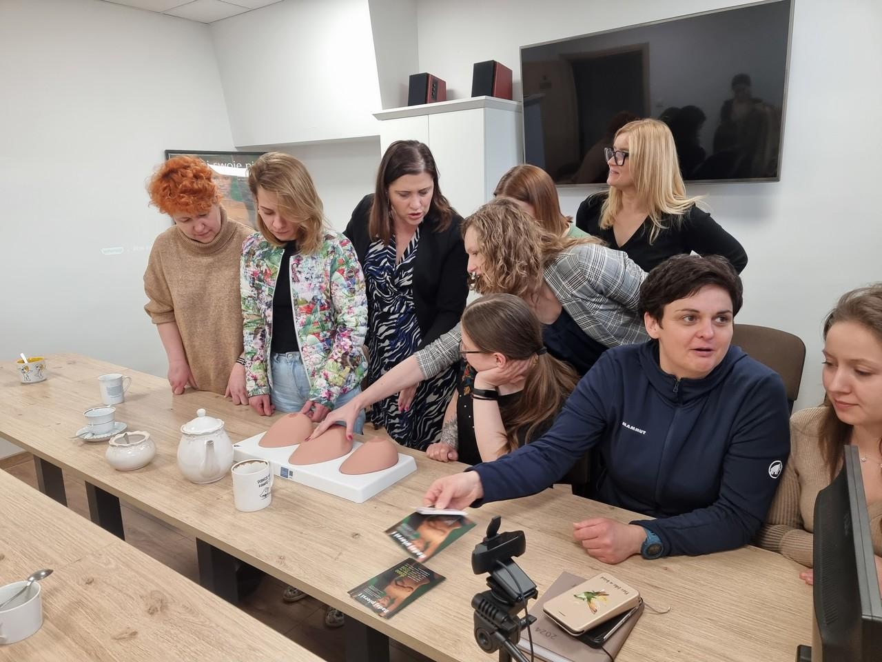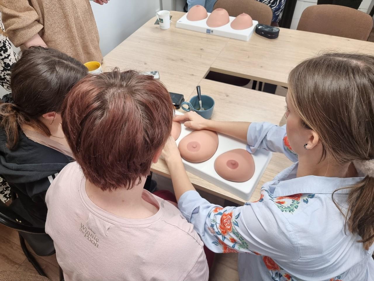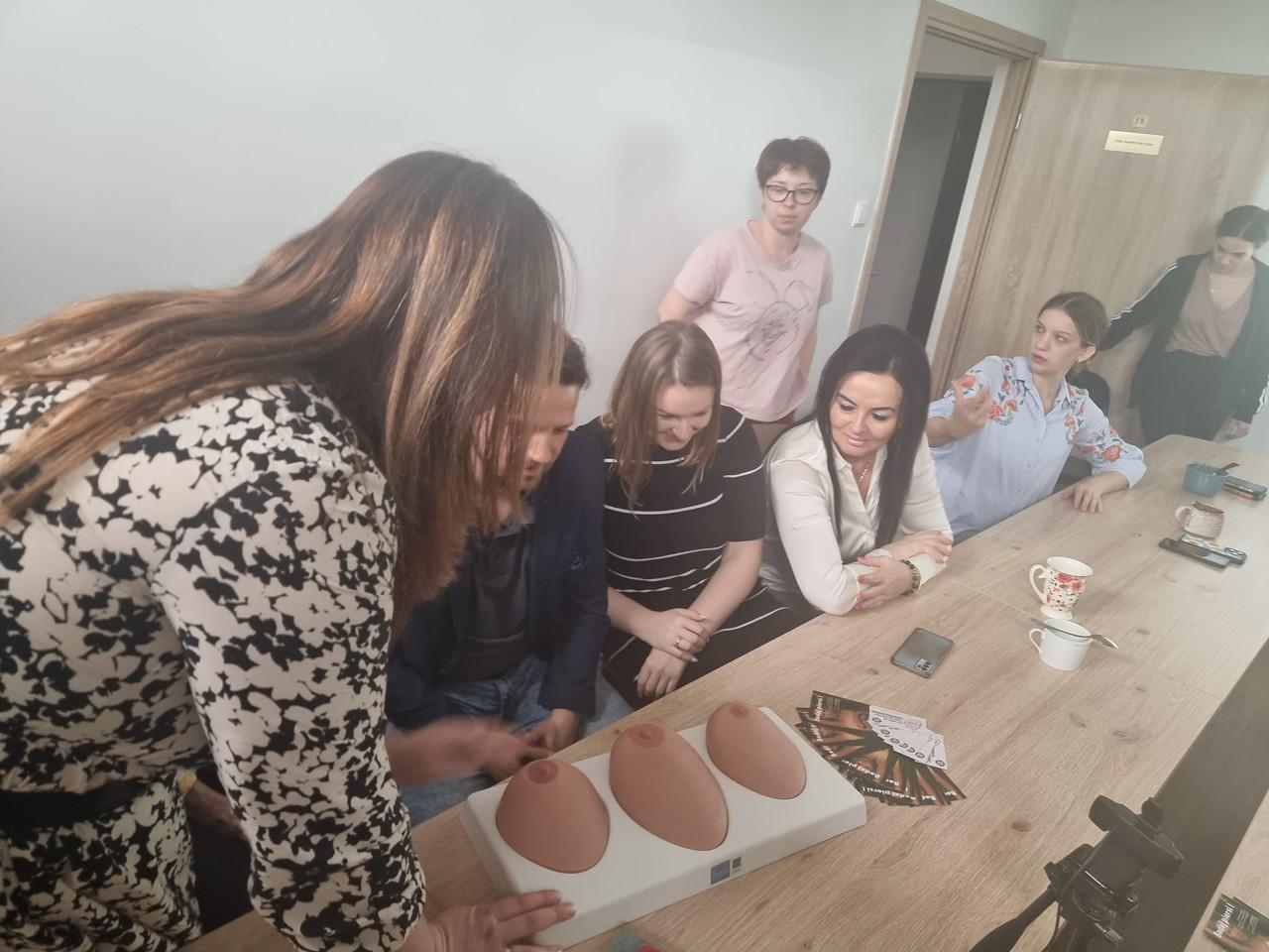 Następnie Agnieszka Stępniak i Joanna Jaroma-Woźniak przy użyciu fantomów przeprowadziły instruktaż samobadania piersi. Na zakończenie wszyscy uczestnicy spotkania otrzymali broszurę „Badaj piersi !” oraz kalendarz opracowany przez Wojewódzką Stację Sanitarno- Epidemiologiczną w Poznaniu.