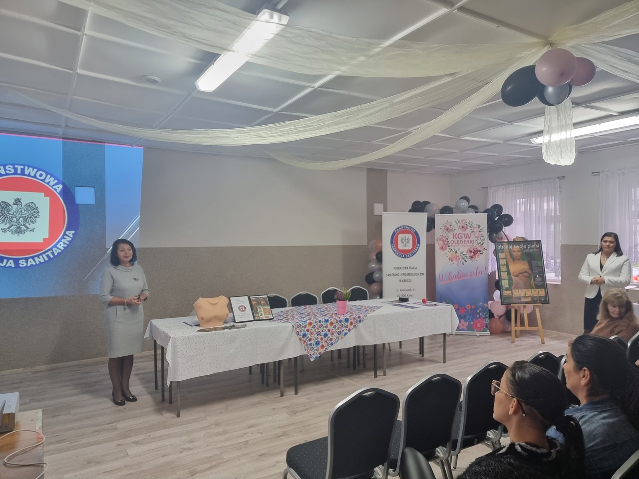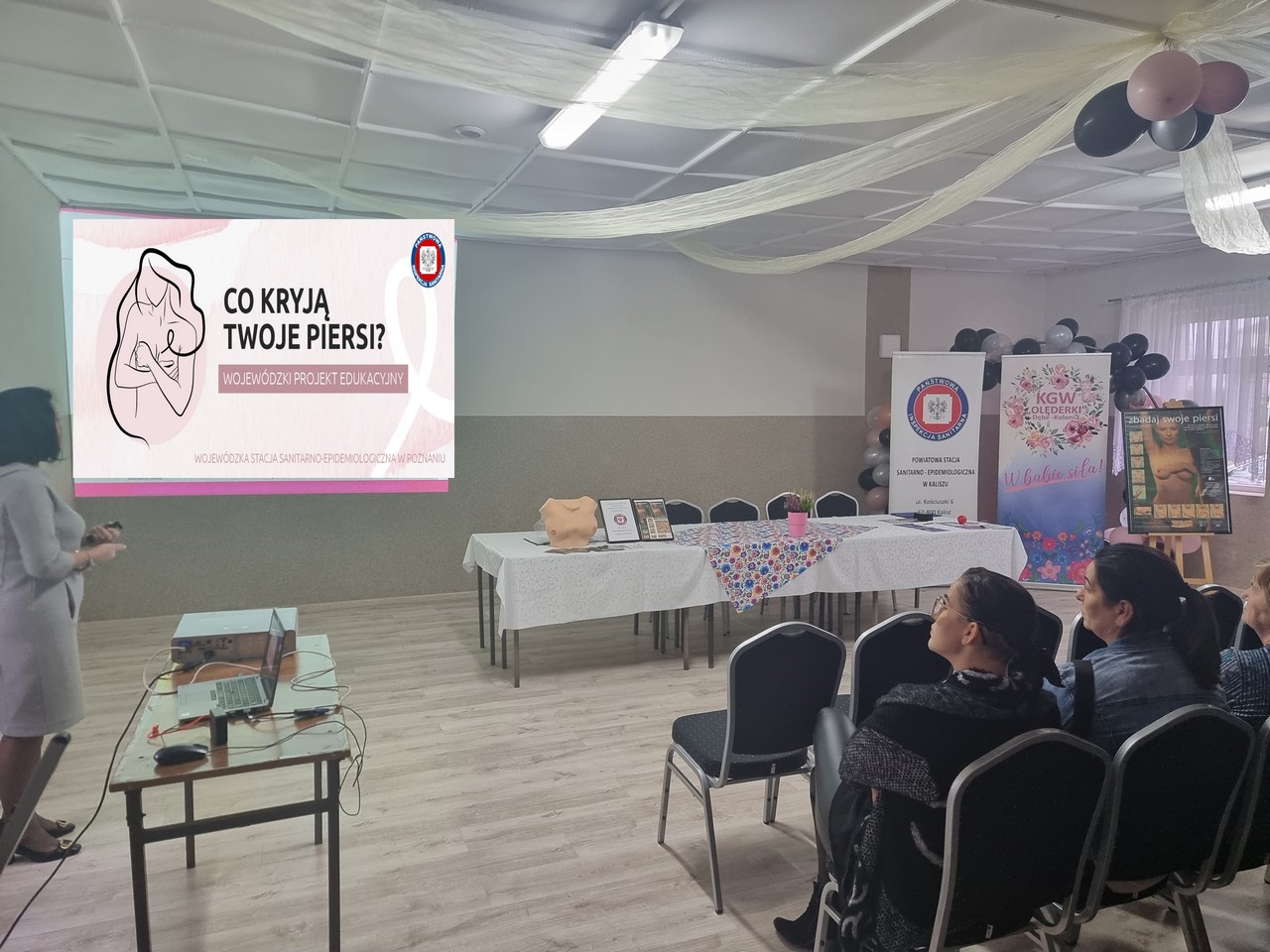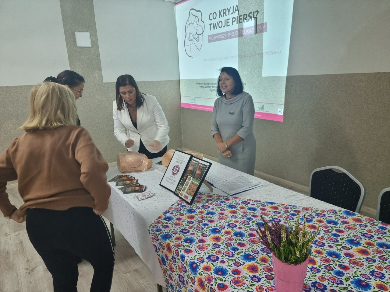 Wyświetlono filmy edukacyjne: kampanie oraz instruktaż samobadania piersi.