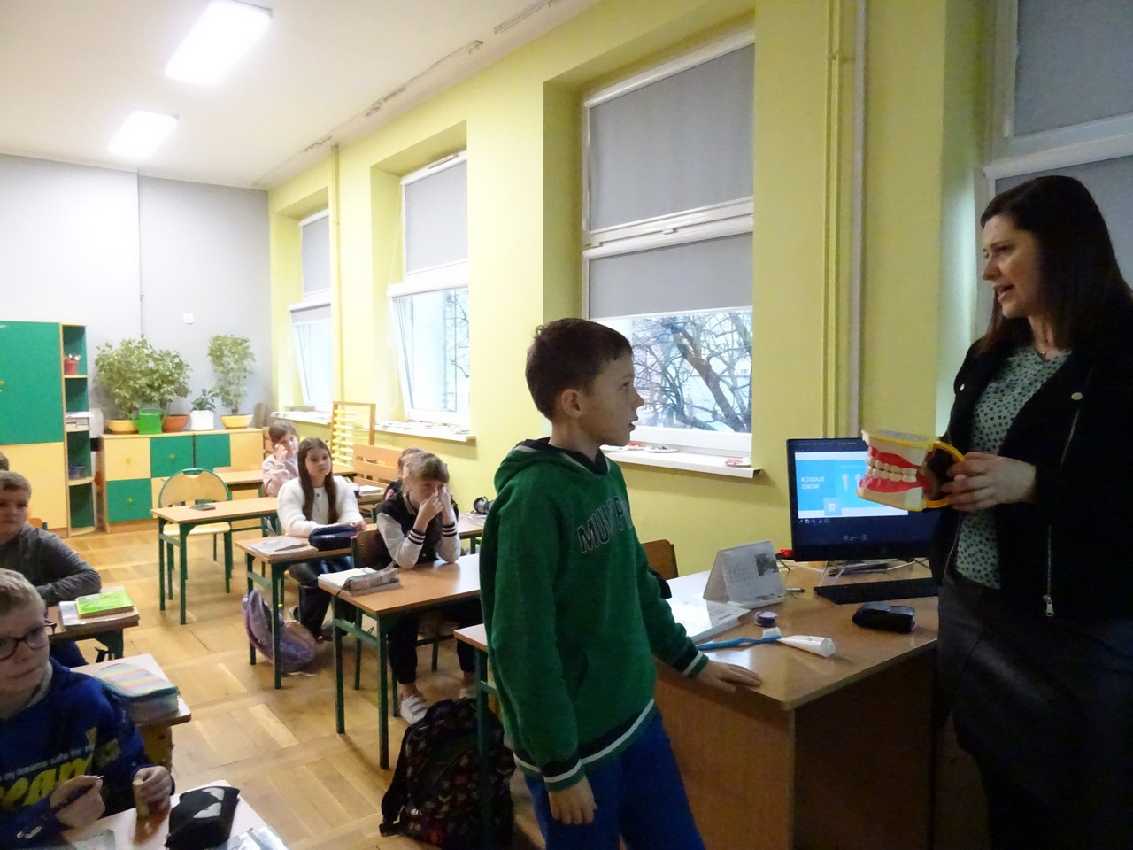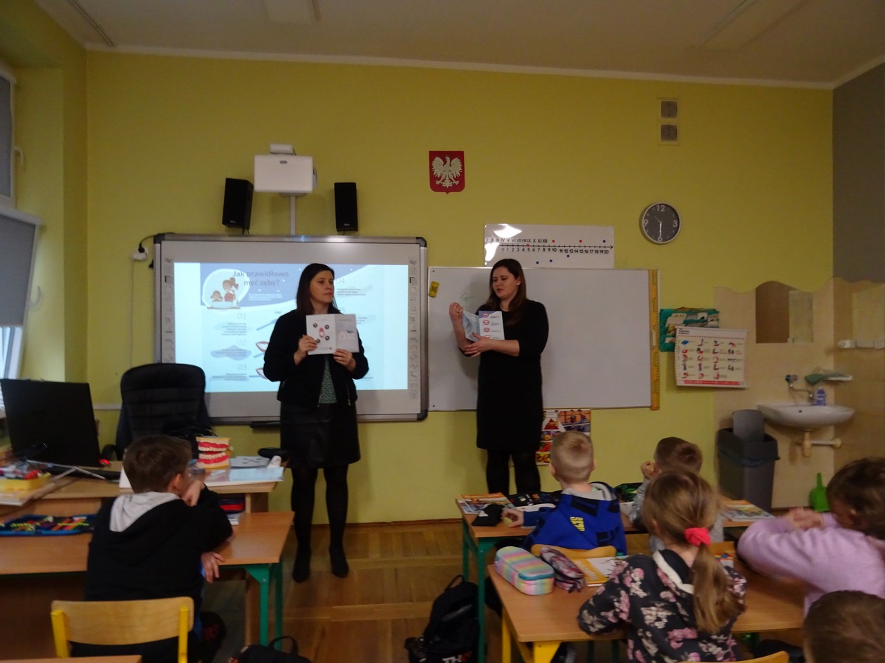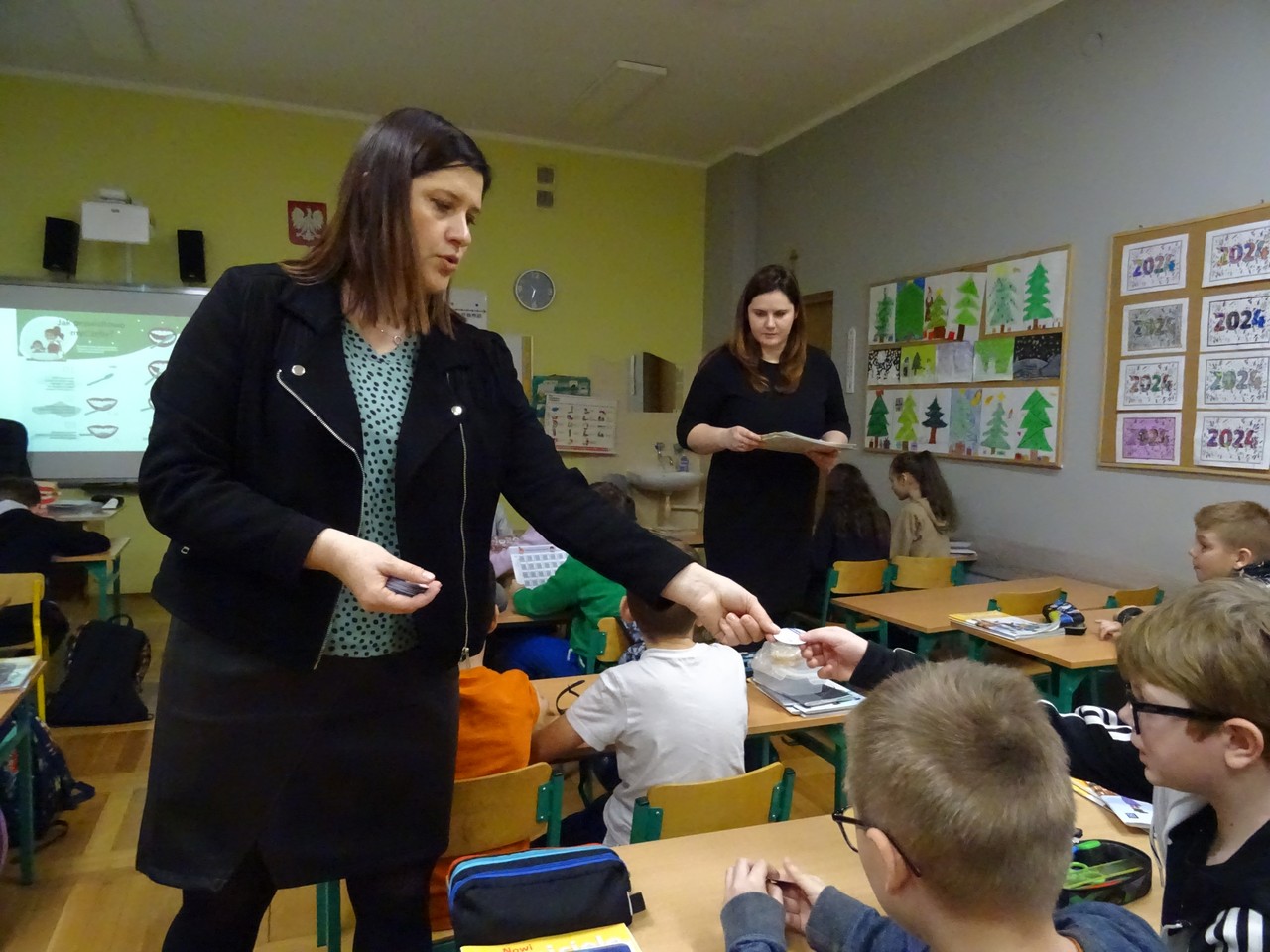 4 stycznia 2024 r. w Szkole Podstawowej nr 16 w Kaliszu, pracownicy Sekcji Oświaty Zdrowotnej i Promocji Zdrowia Powiatowej Stacji Sanitarno-Epidemiologicznej w Kaliszu Agnieszka Stępniak i Joanna Jaroma-Woźniak, w ramach wojewódzkiego projektu edukacyjnego „Mam zdrowe zęby!” przeprowadzili pogadankę z instruktażem prawidłowego mycia zębów wśród uczniów jednej klasy.