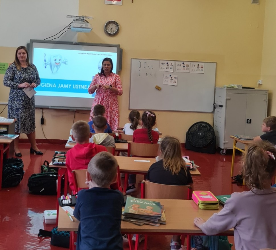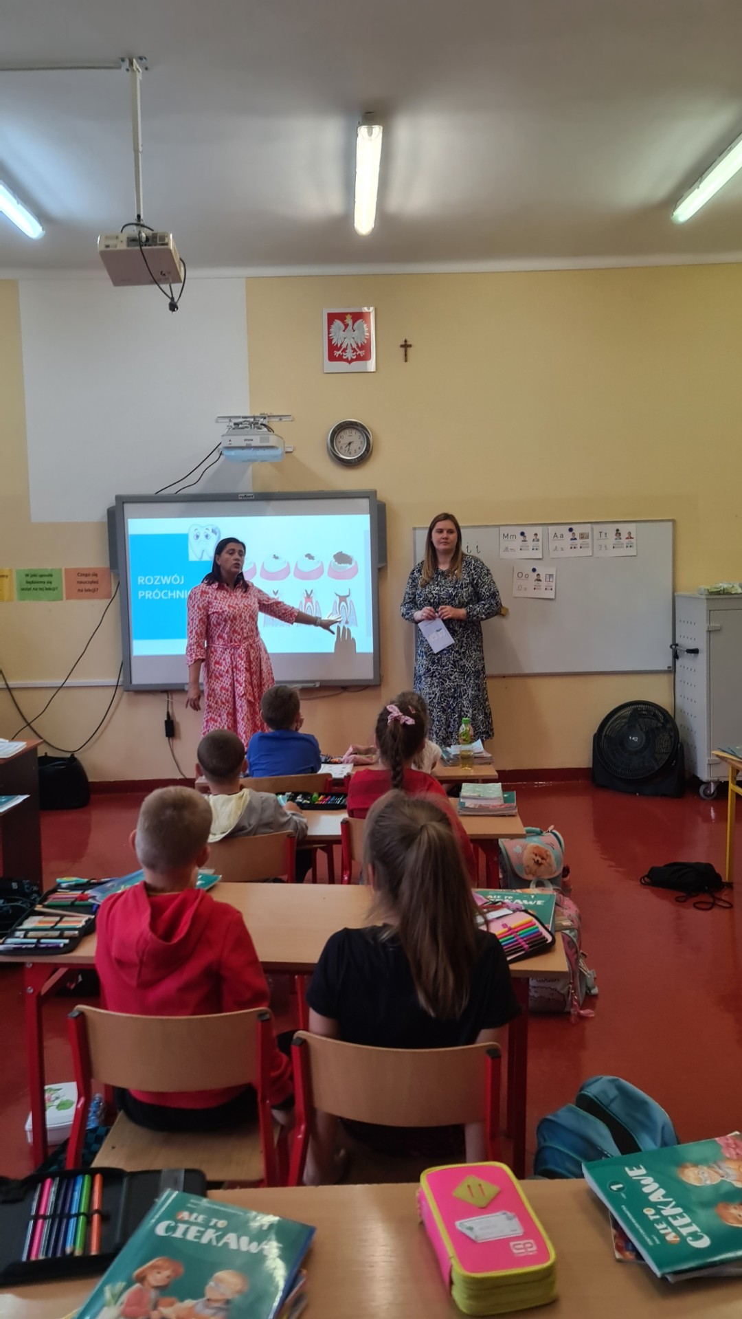 2 października 2024 r. odbyły się zajęcia w ramach wojewódzkiego projektu edukacyjnego: „Mam zdrowe zęby!” wśród uczniów klas pierwszych Szkoły Podstawowej im. Jana III Sobieskiego w Zbiersku. Pracownicy Sekcji Oświaty Zdrowotnej i Promocji Zdrowia Powiatowej Stacji Sanitarno- Epidemiologicznej w Kaliszu: Agnieszka Stępniak oraz Joanna Jaroma – Woźniak, przeprowadzili 2 pogadanki połączone z instruktażem mycia zębów w oparciu o prezentację multimedialną oraz z wykorzystaniem dużego modelu szczęki.