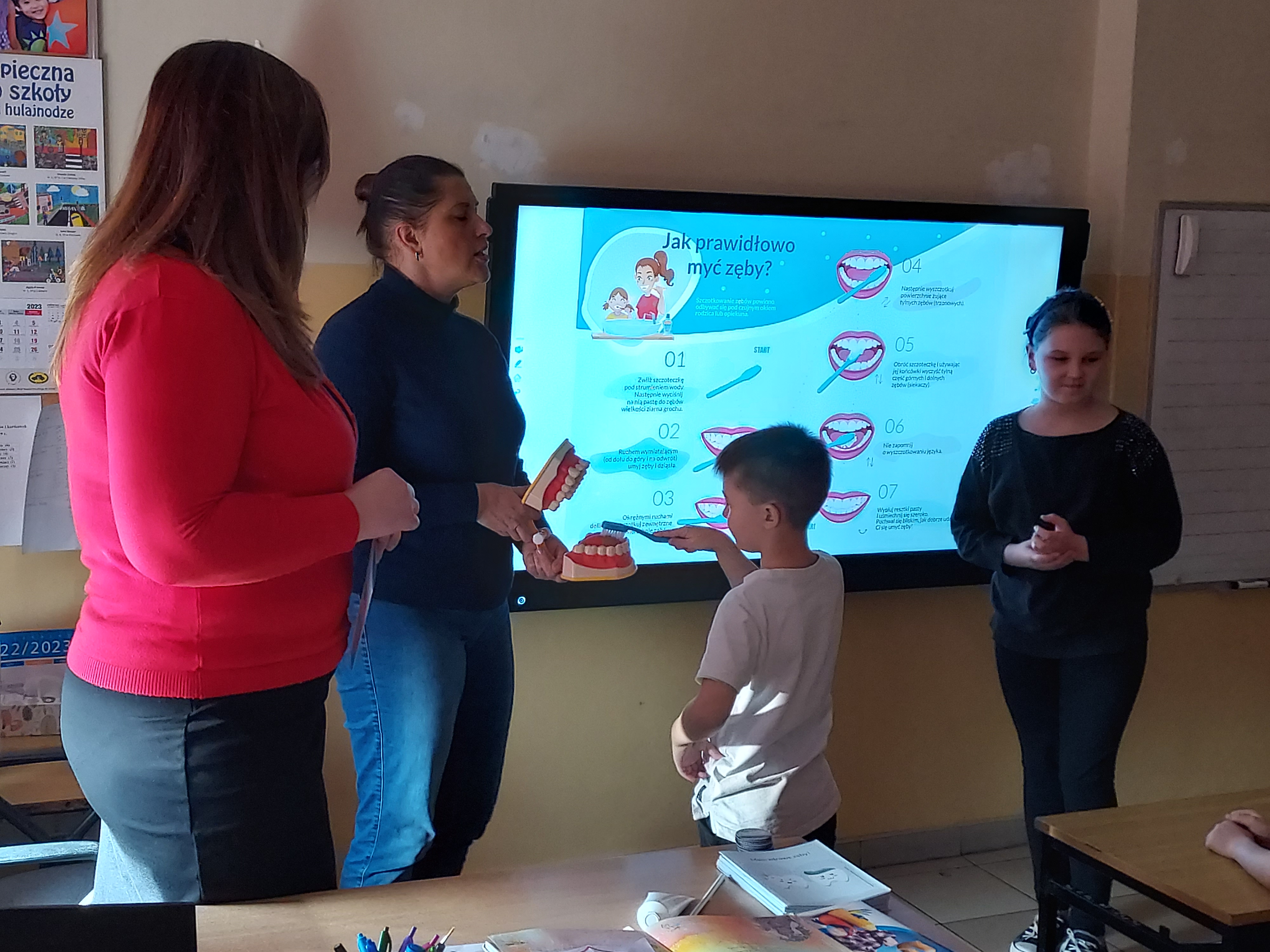Podczas zajęć wykorzystano duży model szczęki, a także materiały edukacyjne i gadżety otrzymane od Wojewódzkiej Stacji Sanitarno– Epidemiologicznej w Poznaniu.