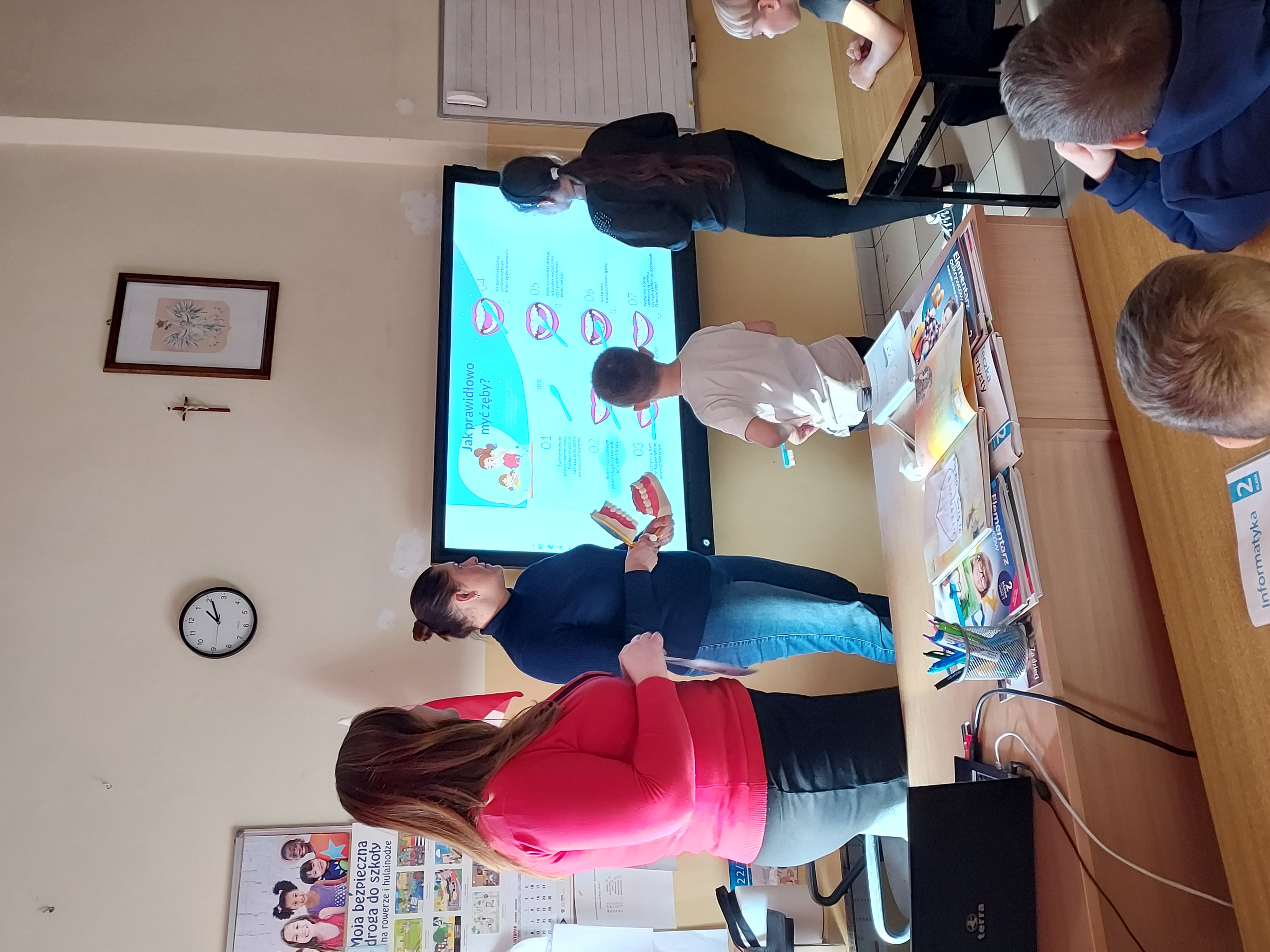 Wśród uczniów klasy II i III przeprowadzono pogadankę z instruktażem prawidłowego mycia zębów.