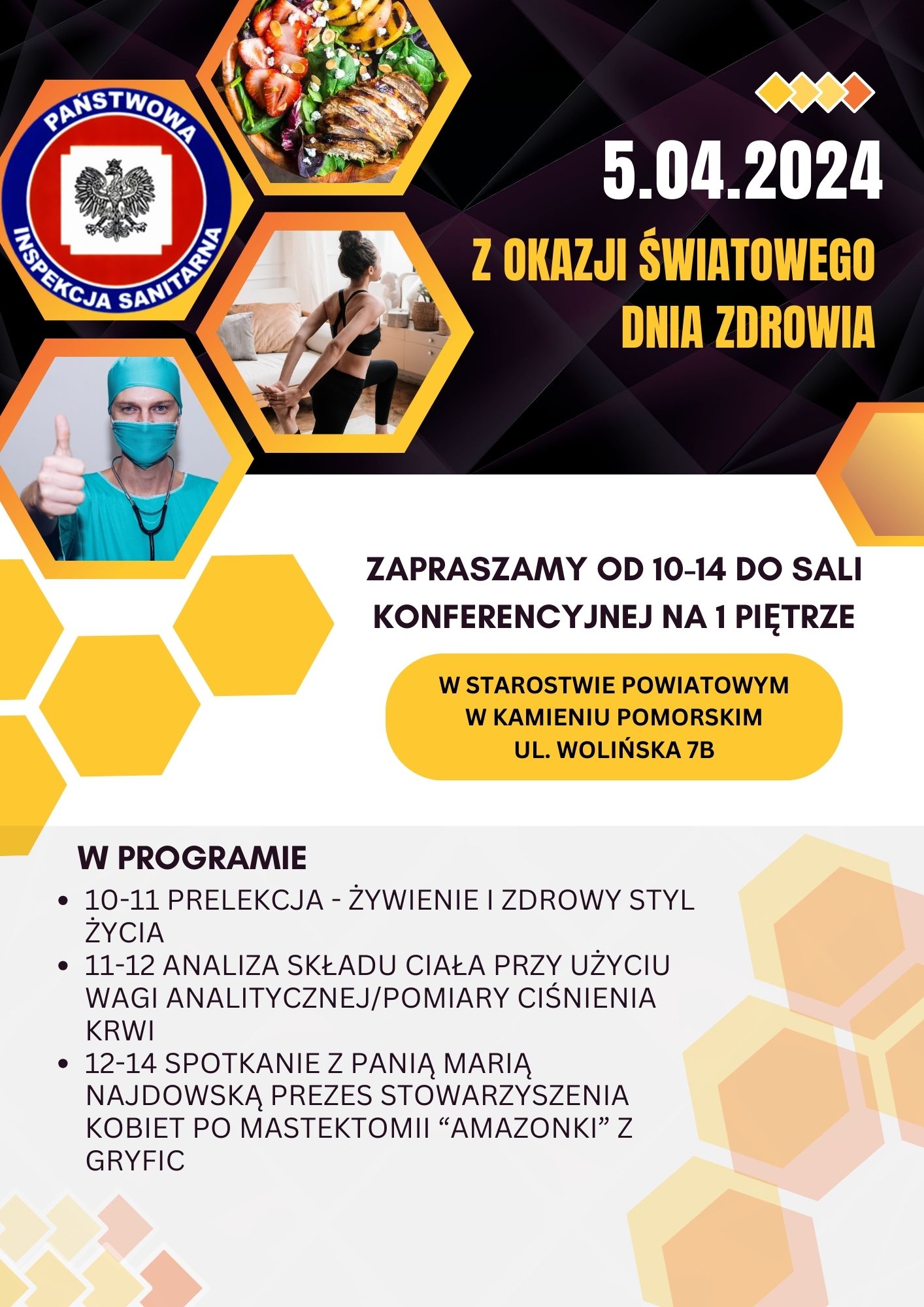 Z okazji obchodów Światowego Dnia Zdrowia Powiatowa Stacja Sanitarno-Epidemiologiczna w Kamieniu Pomorskim zaprasza wszystkich chętnych do udziału w cyklu spotkań dotyczących zdrowego żywienia i profilaktyki raka piersi. Wykonywane będą również pomiary ciśnienia krwi oraz analiza składu ciała przy użyciu wagi analitycznej. Spotkania odbędą się 05.04.2024 (piątek) od godz. 10-14 w sali konferencyjnej na pierwszym piętrze Starostwa Powiatowego w Kamieniu Pomorskim.