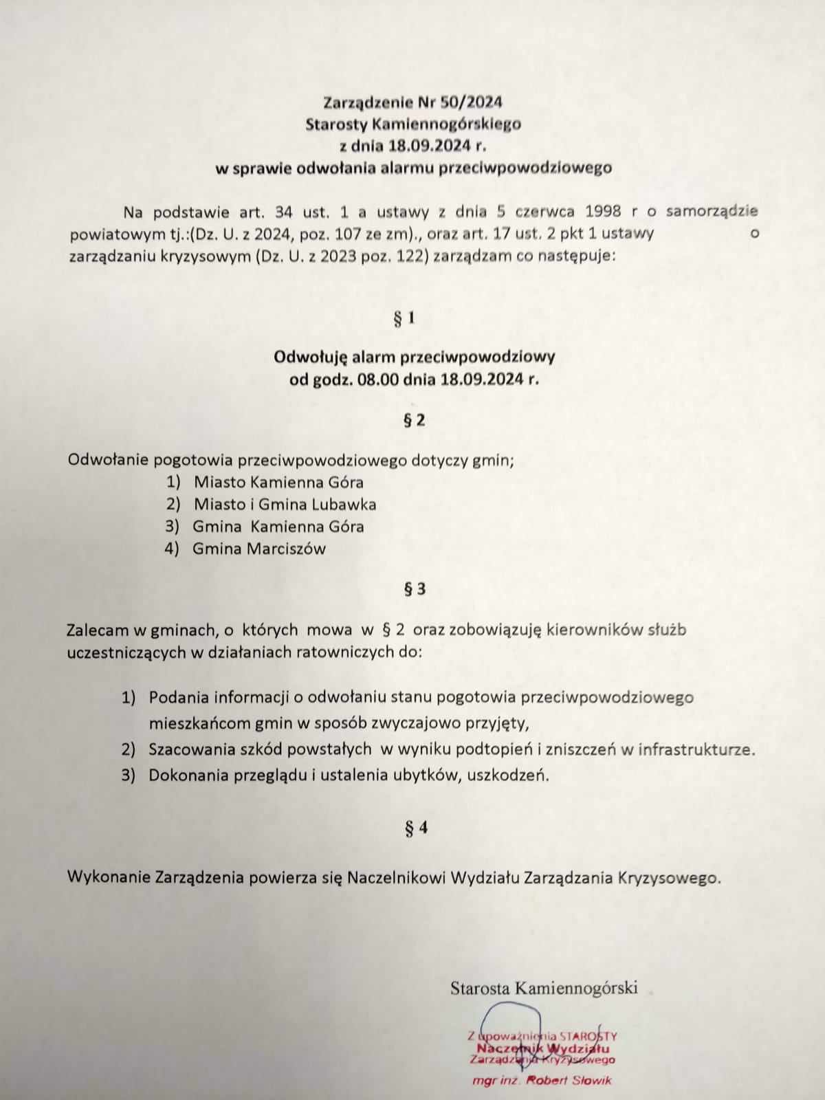 Odwołanie alarmu przeciwpowodziowego