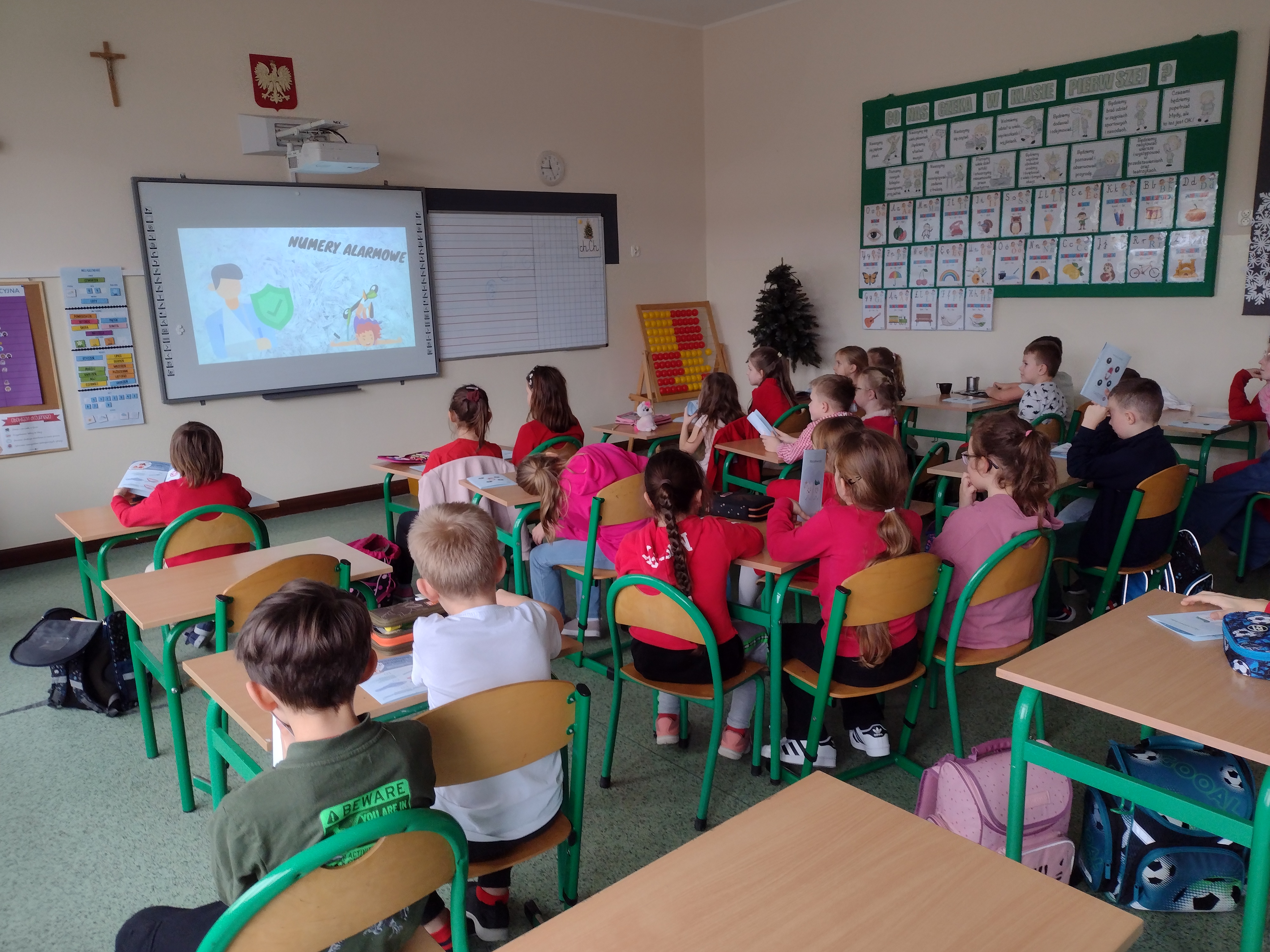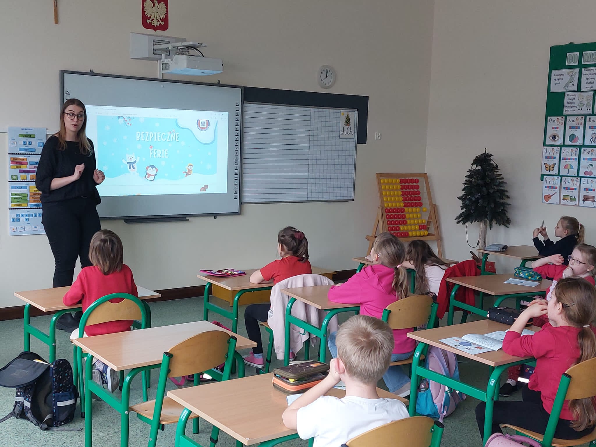 Podczas zajęć przedstawiono prezentację „Bezpieczne ferie”- z podstawowymi informacjami dotyczącymi bezpieczeństwa i organizacji zimowego wypoczynku oraz podstawowymi numerami alarmowymi. Na części warsztatowej pracownik przedstawił instruktaż prawidłowego mycia rąk.
