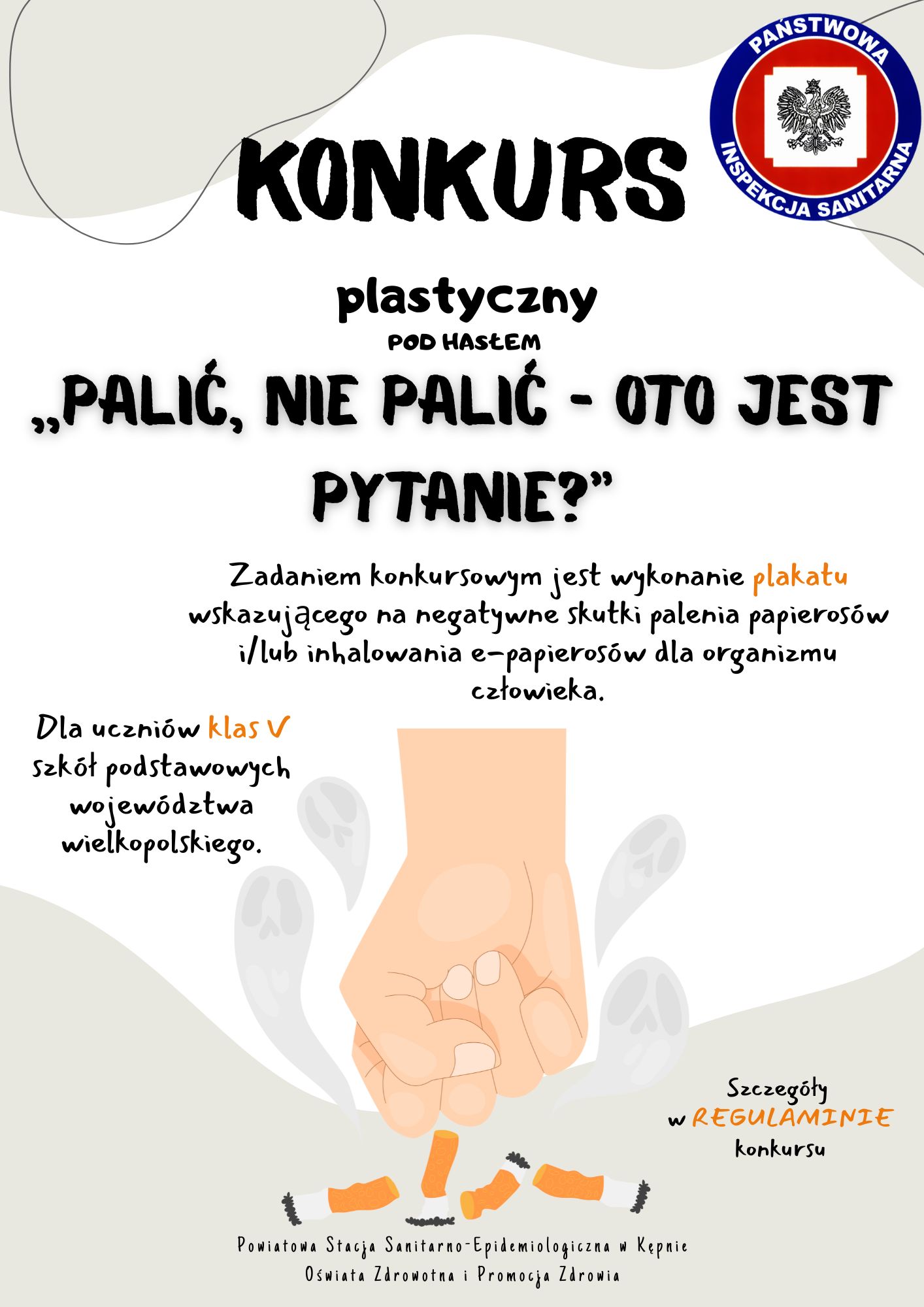 Zadaniem konkursowym jest wykonanie plakatu wskazującego na negatywne skutki palenia papierosów i/lub inhalowania e-papierosów dla organizmu człowieka.