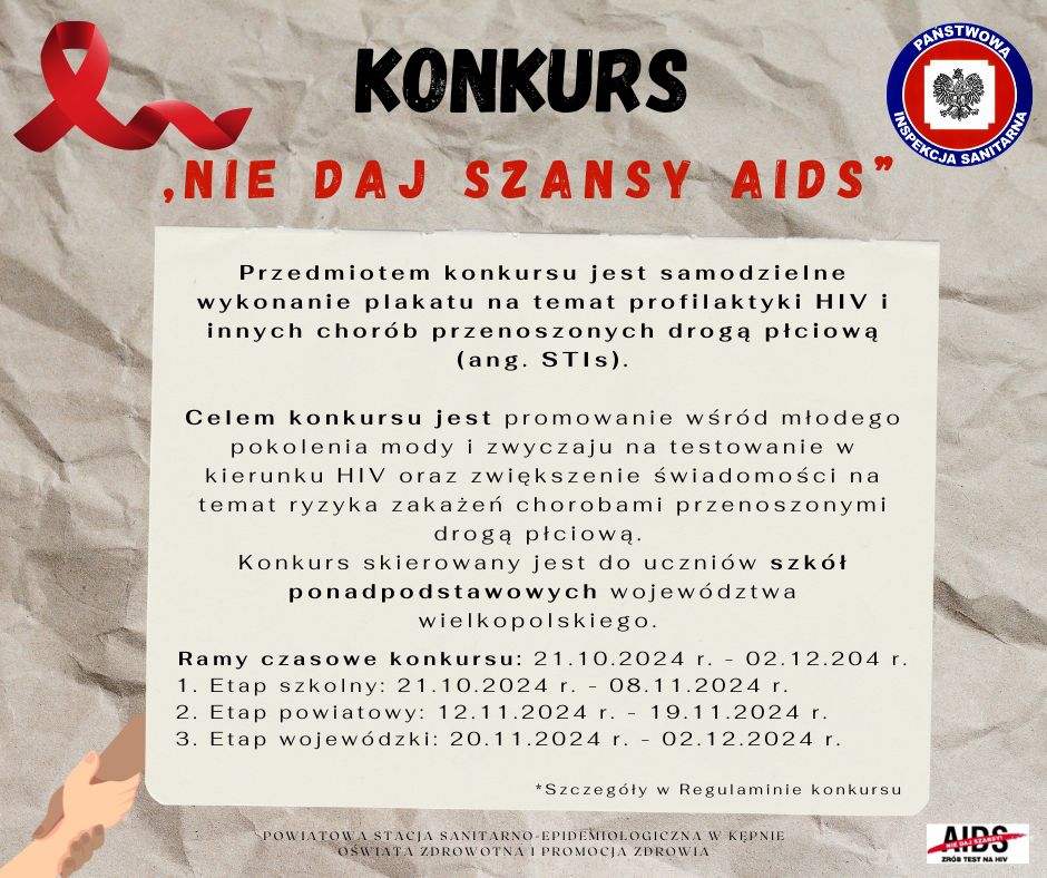 Zapraszamy uczniów szkół ponadpodstawowych do wzięcia udziału w konkursie pod hasłem „Nie daj szansy AIDS”. W roku szkolnym 2024/25 odbędzie się XXII edycja konkursu.