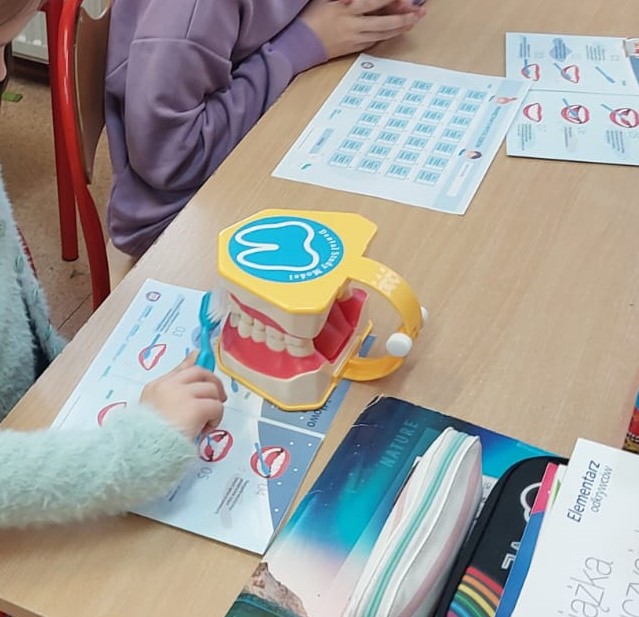 Na terenie placówki przeprowadzono pogadankę, pokaz i instruktaż prawidłowego mycia zębów na modelu szczęki oraz przedstawiono prezentację multimedialną i zabawę edukacyjną.
