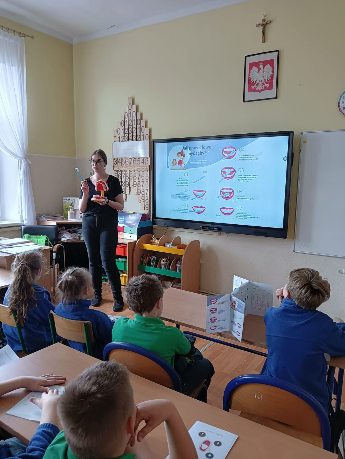 Na terenie placówki przeprowadzono pogadankę, pokaz i instruktaż prawidłowego mycia zębów na modelu szczęki oraz przedstawiono prezentację multimedialną. Na zakończenie, każdy uczeń otrzymał magnes, kalendarz prawidłowego mycia zębów oraz broszurkę opracowaną przez Wojewódzką Stację Sanitarno-Epidemiologiczną w Poznaniu. Klasie przekazano dyplom za udział w zajęciach na temat higieny jamy ustnej.