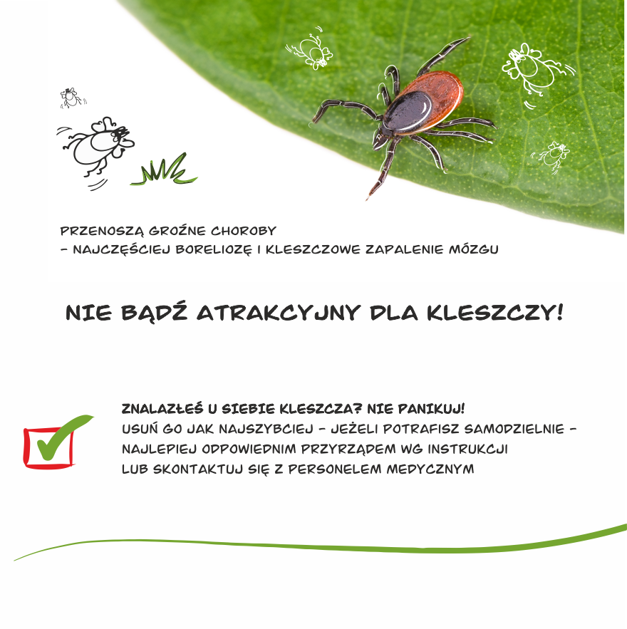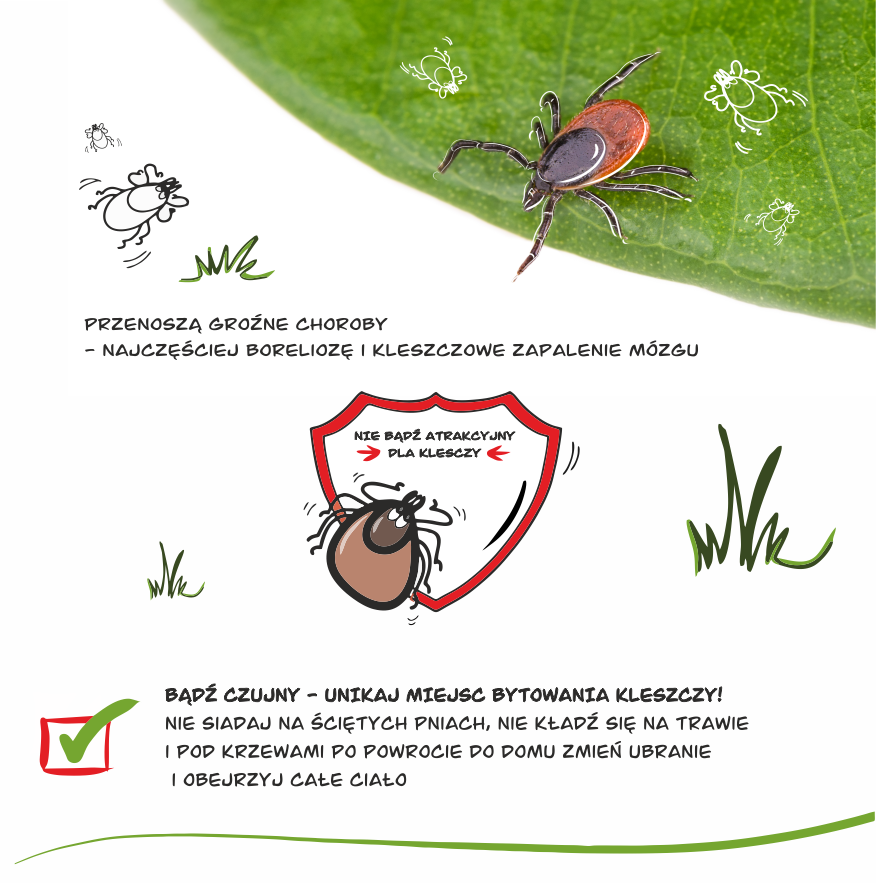 Idea Kampanii powstała w wyniku przeprowadzonej analizy epidemiologicznej zachorowań na choroby odkleszczowe. Z roku na rok wzrasta liczba zachorowań na boreliozę. W 2022r. zapadalność na boreliozę zarówno w woj. śląskim jak i warmińsko-mazurskim była powyżej średniej krajowej. W woj. śląskim wynosiła 48,9, w woj. warmińsko-mazurskim 61,4, a w Polsce 45,4. Mając na uwadze rosnącą liczbę zachorowań na boreliozę, Śląski Państwowy Wojewódzki Inspektor Sanitarny i Warmińsko-Mazurski Państwowy Wojewódzki Inspektor Sanitarny zainicjowali działania informacyjno-edukacyjne skierowane do ogółu społeczeństwa, ze szczególnym uwzględnieniem: kadry pedagogicznej, dzieci i młodzieży, rodziców i opiekunów, seniorów oraz rolników. Celem kampanii jest propagowanie podstawowych zasad ochrony przed kleszczami, edukacja w zakresie prawidłowego usuwania kleszcza, zwiększenie społecznej świadomości w zakresie profilaktyki chorób przenoszonych przez kleszcze, zwiększenie wiedzy na temat szczepień ochronnych jako skutecznej metody profilaktyki kleszczowego zapalenia mózgu. Partnerami kampanii są Polskie Towarzystwo Higieniczne oraz Warmińsko-Mazurskie Stowarzyszenie Higieny i Zdrowia Publicznego w Olsztynie. Choroby odkleszczowe stanowią niezwykle aktualny problem zdrowia publicznego. To grupa chorób zakaźnych przenoszonych przez zainfekowane kleszcze. Do zakażenia zwykle dochodzi na skutek ukłucia, w czasie którego do krwiobiegu wraz ze śliną lub wymiotami kleszcza dostają się groźne patogeny. Najczęściej występującą chorobą odkleszczową jest borelioza z Lyme, która jest przewlekłą wielofazową chorobą układową charakteryzującą się występowaniem objawów skórnych, stawowych, Sezonowa aktywność kleszczy rozpoczyna się, w zależności od temperatury, w końcu marca i trwa zazwyczaj do listopada. Jeszcze jakiś czas temu kleszcze można było spotkać wyłącznie na wilgotnych, porośniętych gęstą trawą łąkach lub w lasach. Obecnie jednak pajęczaki pojawiają się nawet w przydomowych ogródkach, miejskich parkach lub placach zabaw. Najskuteczniejszą ochroną przed ukłuciem przez kleszcza jest przestrzeganie kluczowych zasad, takich jak: ubieranie odpowiedniej odzieży, stosowanie repelentów, obserwacja ciała po powrocie z miejsc narażenia na kontakt z kleszczami. W momencie zaobserwowania kleszcza w skórze, należy szybko i prawidłowo usunąć go z powierzchni ciała. Ze względu na wzrost liczebności kleszczy oraz zwiększenie się obszarów ich występowania bardzo ważna jest edukacja społeczeństwa w zakresie profilaktyki chorób odkleszczowych, ponieważ nigdy nie można być pewnym, że unikniemy pokłucia przez kleszcze. Kampania realizowana jest przy współpracy z Powiatowymi Stacjami Sanitarno-Epidemiologicznymi z woj. śląskiego i warmińsko-mazurskiego. |