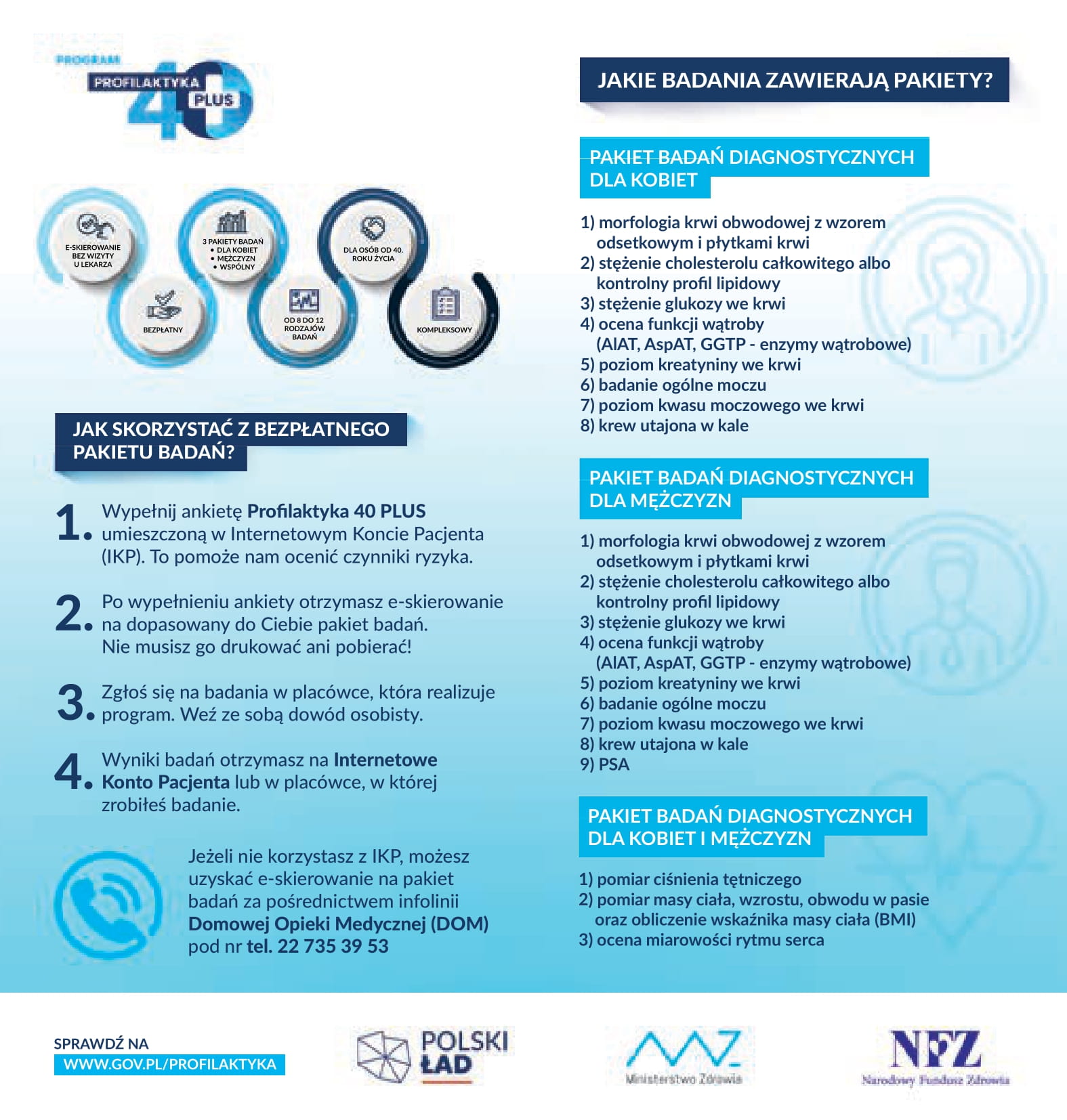 Profilaktyka 40+ 07.07.2021 Masz 40 lat lub więcej? Skorzystaj z pakietu bezpłatnych badań diagnostycznych. Więcej na: http://gov.pl/profilaktyka https://www.gov.pl/web/zdrowie/profilaktyka-40-plus Wideo Zdjęcia (1) Pokaż zdjęcie 1 z galerii.